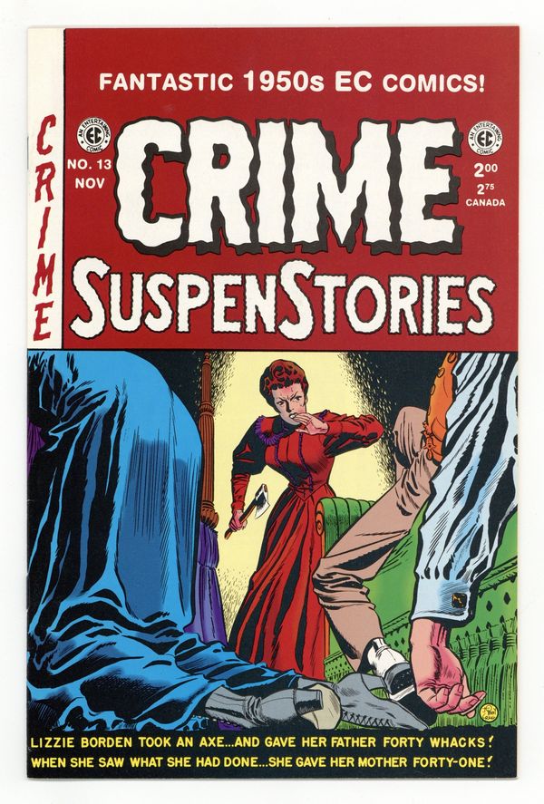 Reprints. Cover art by Johnny Craig. "Hear No Evil!", script by Albert B. Feldstein, pencils by Jack Kamen, inks by Johnny Craig; Rita is introduced to Fred Reardon at a party and sets her sights on marrying this rather wealthy man, even though he is stone deaf.....for his money, of course. Soon, she falls in love with Vance Tobin and together they plot to kill Fred. "First Impulse!", script by Albert B. Feldstein, art by Sid Check; Joan and Helen are at each other's throats, as Helen believes that her sister is making eyes at Bob, her boyfriend; In addition, Helen also overhears the two planning a lunch at a cafe when they will surprise her with some news; So, Helen follows the two, and when she sees the two enter a jewelry store and pick out a ring, she feels her fears are validated. "Second Chance?", script by Albert B. Feldstein, art by Sid Check; Helen is waiting for Bob and Rita to return home and she confronts them both with a gun, accusing Joan of attempting to steal her boyfriend from her; They protest, just as the delivery man from the jewelry store arrives with the package with the wedding ring in it. "Freak!" text story by Albert B. Feldstein, art by Marie Severin. "A Question of Time!!", script by Albert B. Feldstein, pencils by Al Williamson, inks by Angelo Torres; A woman is found murdered and horribly mutilated, in a tourist cabin and the suspicion is that Harry Wismer has murdered his wife. "Forty Whacks!", script by Al Feldstein, art by Jack Kamen; Fanny is 22 years old, but her parents will not let her use makeup, choose her own clothing or date boys, and she has had it up to here over it; Running up to the attic, she discovers an old hatchet, and a plan forms in her mind. 36 pgs., full color. Cover price $2.00.