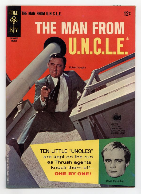 Comic book version of the 1960s spy/secret agent series. Issue features "The Ten Little Uncles Affair" in which agents Napoleon Solo and Illya Kuryakin investigate mysterious murders of fellow agents. The story is a version of the famous Agatha Christie murder mystery novel "Ten Little Indians." Issue also features one-page spy techniques and case features. Photos on covers. Story and artcredits: unknown. Number/month on Cover: 10146-603, March Cover price $0.12.
