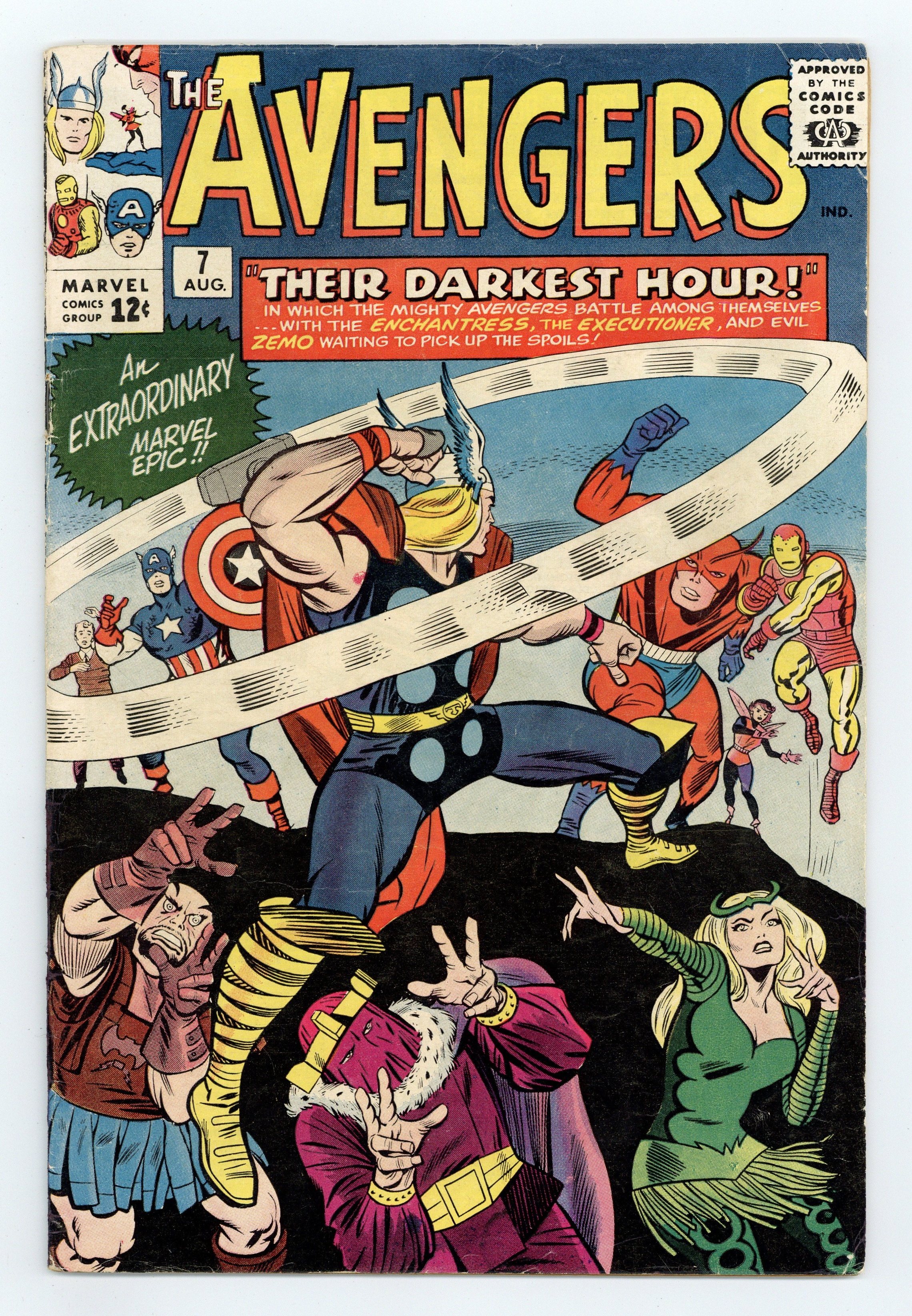 Cover pencils by Jack Kirby, inks by Chic Stone. Rick Jones dons Bucky's costume in "Their Darkest Hour!", script by Stan Lee, pencils by Jack Kirby, inks by Chic Stone; In Asgard, the Enchantress and the Executioner are banished to Earth by Odin; There they find Zemo (who had managed to escape the authorities) and they team up with him to stop Captain America; The Enchantress' motive is to get Thor by her side; She successfully lures Thor and hypnotizes him to fight for them; Meanwhile Captain America travels to the Amazon jungle to capture Zemo; Captain America then wins against Zemo's forces and Zemo tries to escape; Captain America grabs onto to the escape ship, however; The other Avengers fight Thor and, thanks to Iron Man, bring him back to his senses; Zemo's ship flies to the Avengers battle to rescue the Executioner and the Enchantress. Roster includes Thor, Iron Man, Giant-Man, Wasp, and Captain America. 36 pgs., full color. $0.12. Cover price $0.12.