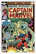 Marvel Spotlight on Captain Marvel - "Blue--Red--Blue!" Written by Doug Moench. Art by Pat Broderick and Gene Day. Cover by Al Milgrom. Captain Marvel is paid a visit by Eon, the 8 billion year old entity who granted him cosmic awareness! 32 pages, FC. Cover price $0.40.