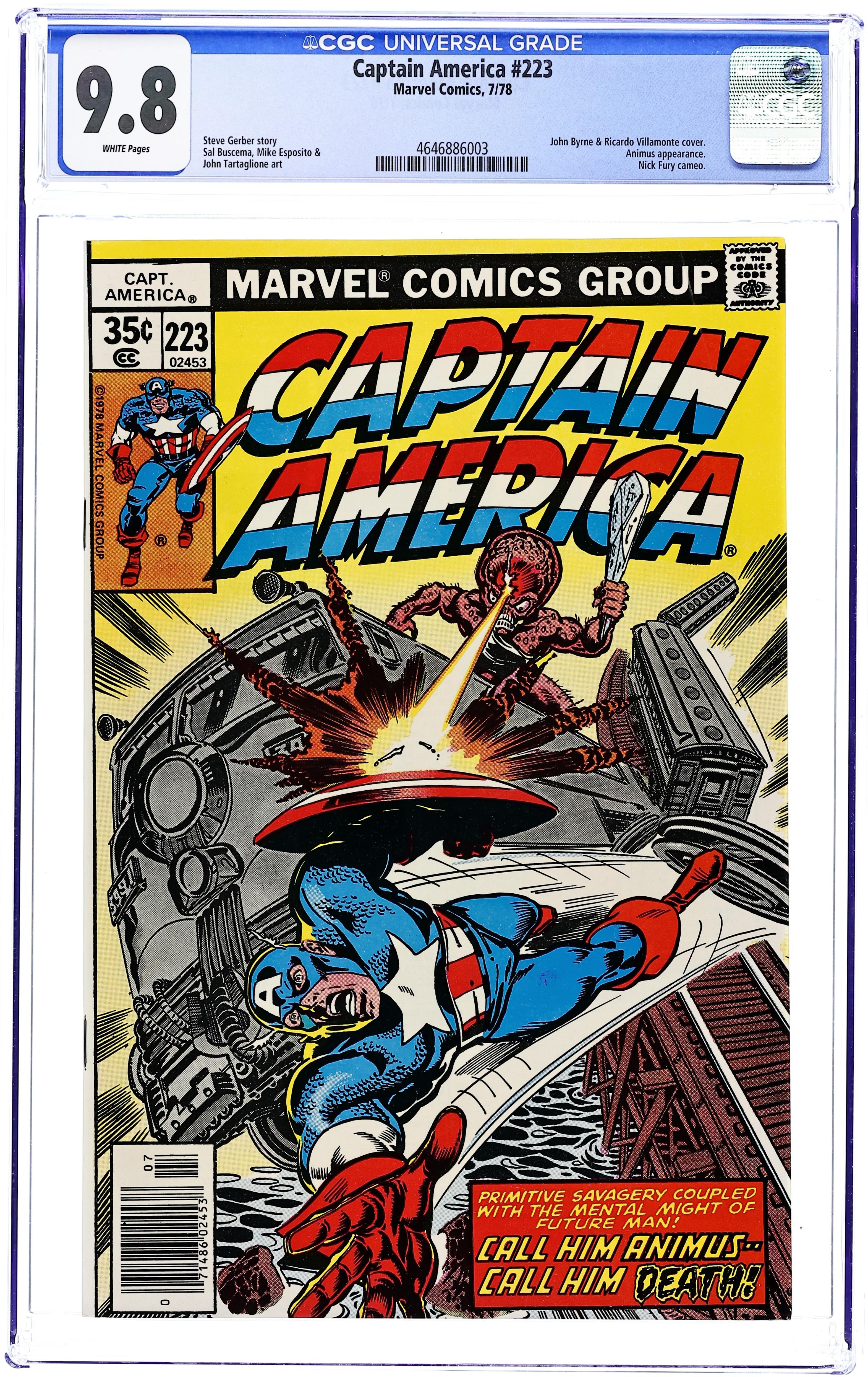 "Call Me Animus" Part 2 of 2. Script by Steve Gerber. Art by Sal Buscema (breakdowns), Mike Esposito (finishes), and John Tartaglione (finishes). Cover by John Byrne and Ricardo Villamonte. In the District of Columbia at the Lincoln Memorial, Animus strikes! And quickly the Sentinel of Liberty is on the defensive vs. this crazy creature! The Animus seems to be a powerful combination of prehistoric man and future man. However, the strange villain vanishes just as Cap is about to win their first fight! The next day as Steve Rogers returns to New York, his passenger train is attacked by Animus! And round two between Captain America and the Animus begins! Cameo appearances by Nick Fury, Veda, and Senator Kligger Stivak. (Notes: Starting with this issue, the Falcon is removed from the cover logo. The title reads "Captain America" only.) 36 pages. Cover price $0.35.