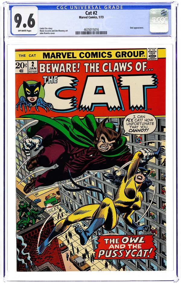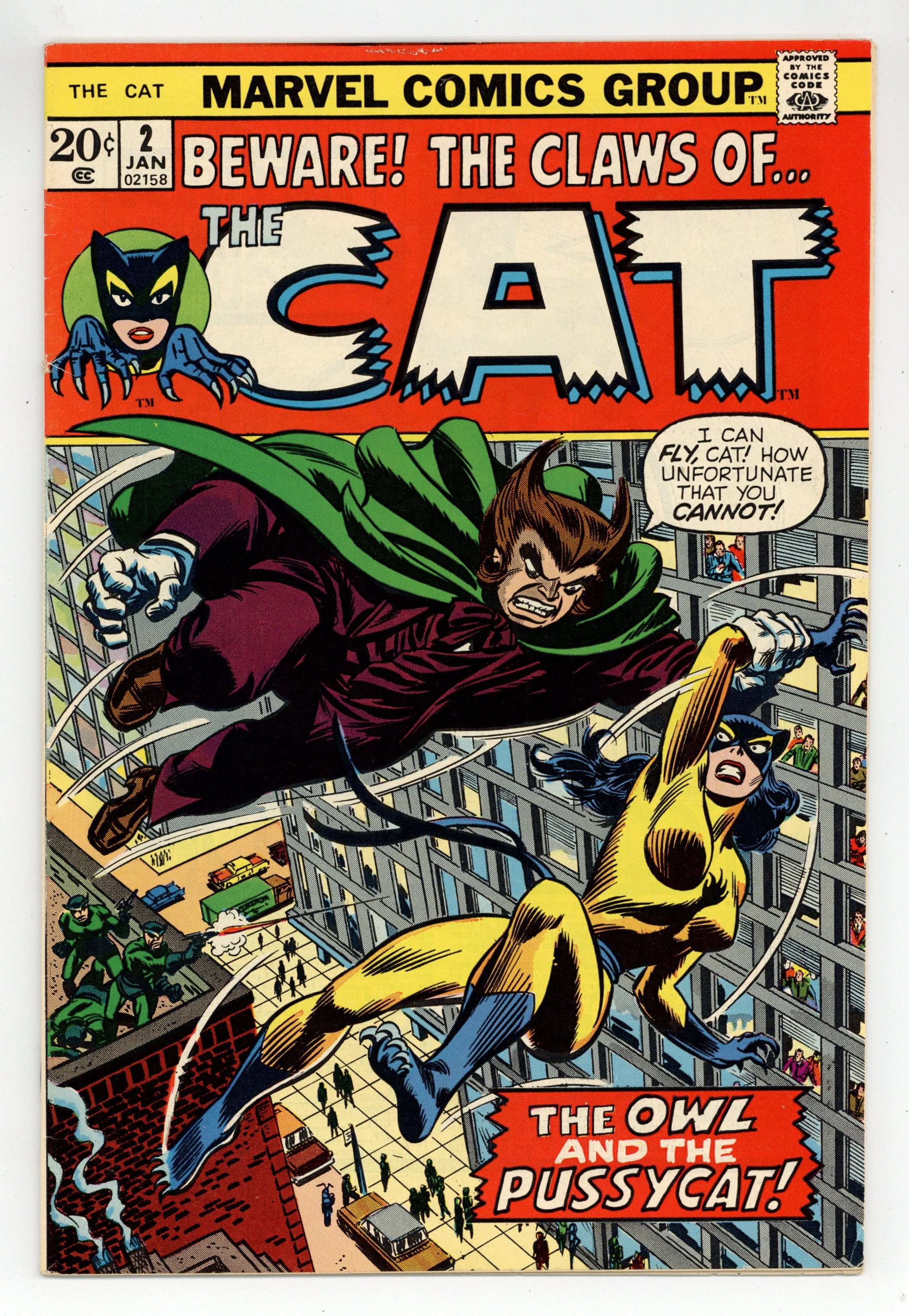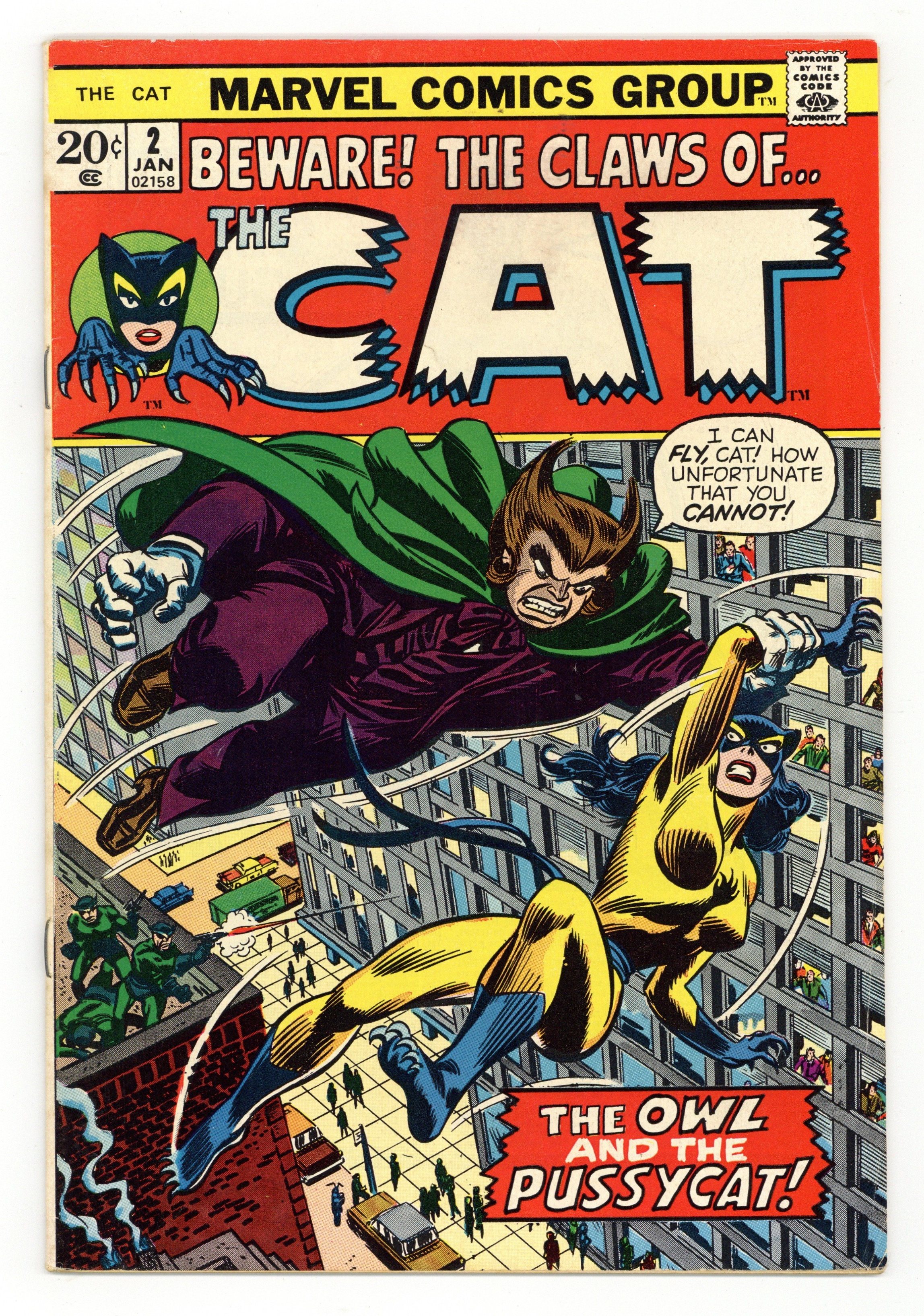 The Owl and the Pussycat!! - Written by Linda Fite. Art by Marie Severin and Jim Mooney. Cover by John Romita, Sr. The Cat takes on The Owl! Characters in this issue: The Cat [Greer Grant Nelson]; The Owl; Broussard [also as Arthur Tumolo] (introduction); Dr. Joanne Tumolo; Mal Donalbain (flashback); Bill Nelson (flashback); The Cat [Shirlee Bryant] (flashback); Zabo (flashback); Ben Richards. 32 pages, full color. Cover price $0.20.