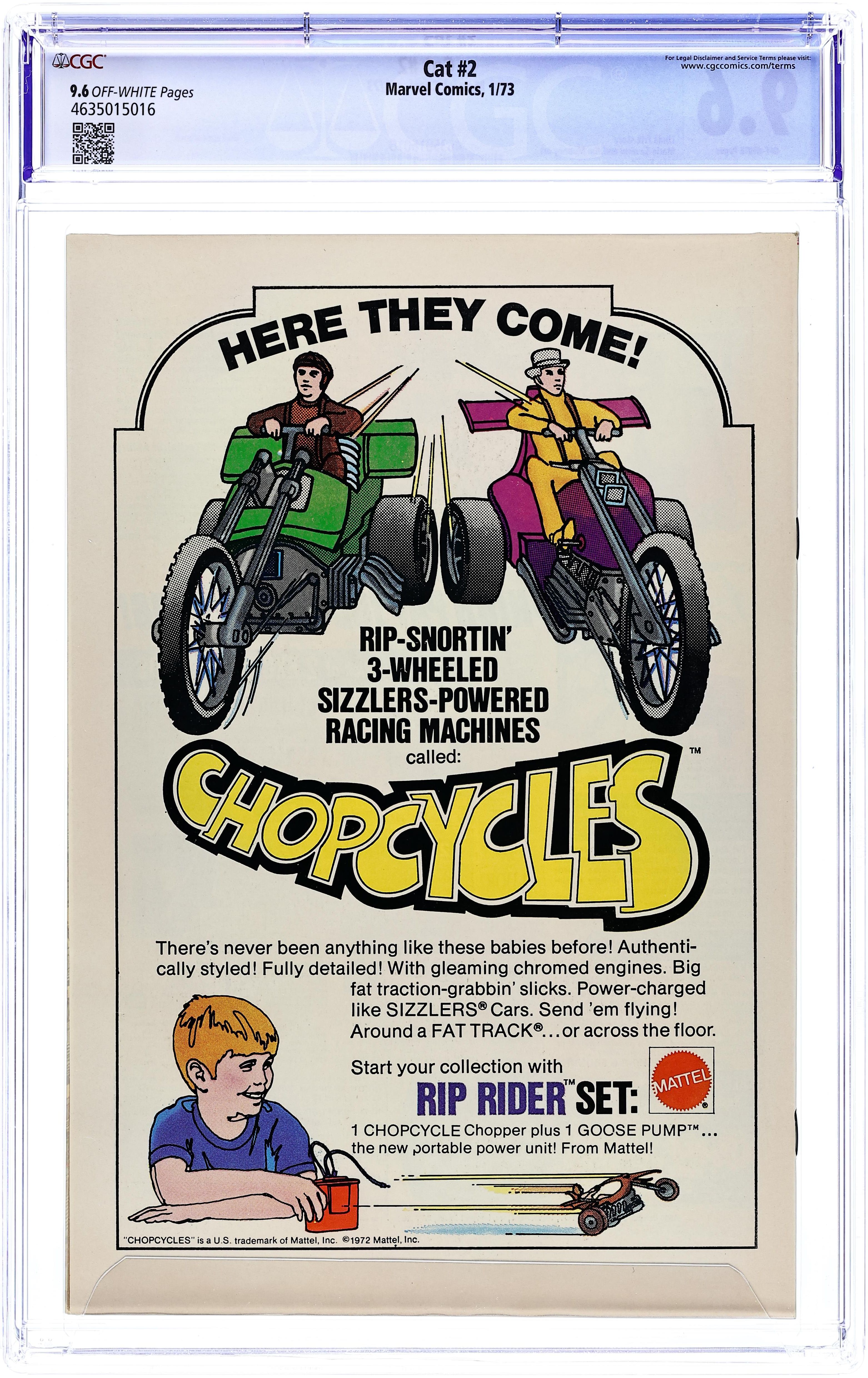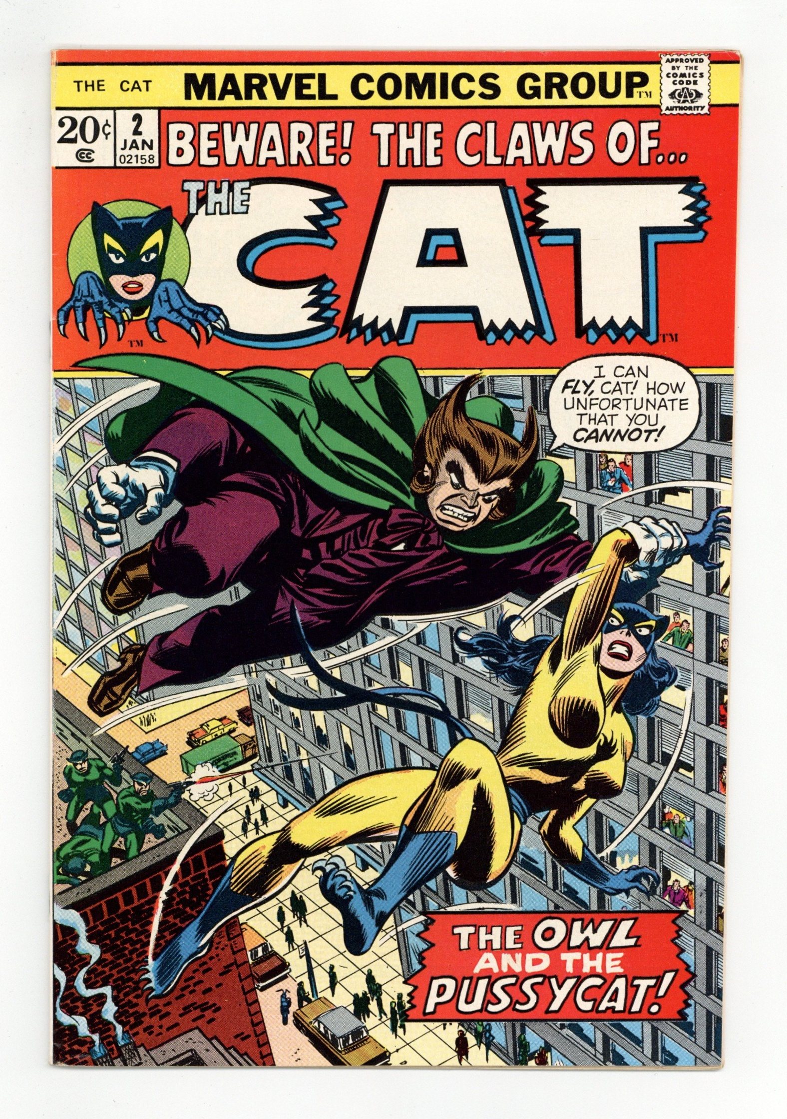 $24.50The Owl and the Pussycat!! - Written by Linda Fite. Art by Marie Severin and Jim Mooney. Cover by John Romita, Sr. The Cat takes on The Owl! Characters in this issue: The Cat [Greer Grant Nelson]; The Owl; Broussard [also as Arthur Tumolo] (introduction); Dr. Joanne Tumolo; Mal Donalbain (flashback); Bill Nelson (flashback); The Cat [Shirlee Bryant] (flashback); Zabo (flashback); Ben Richards. 32 pages, full color. Cover price $0.20.