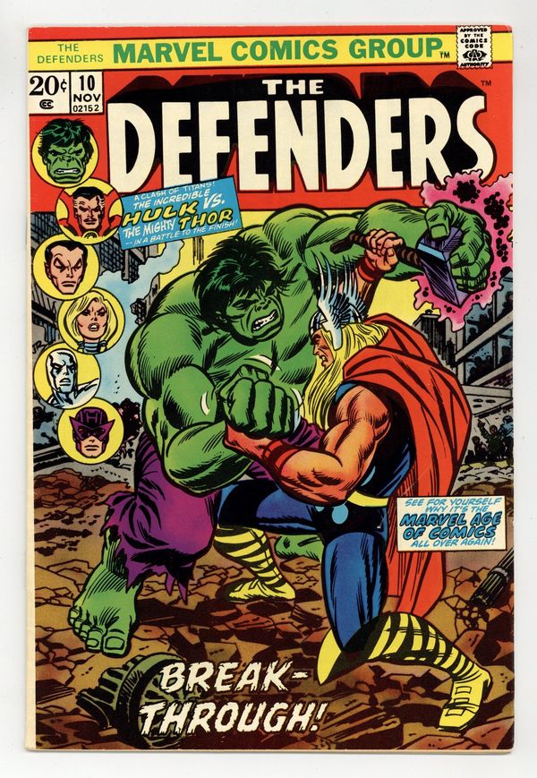 "Breakthrough" Avengers-Defenders crossover. Part 6 of 8. Guest-starring the Avengers. Script by Steve Englehart. Pencils by Sal Buscema. Inks by Frank Bolle. Cover by John Romita. One of the classic issues of the Defenders! Story continues from Avengers 117. The sixth and final superhero battle of the Avengers-Defenders Clash! And as shown on the cover, it's a matchup of true Marvel heavyweights! The Green Goliath rumbles thru the streets of Los Angeles looking for the Evil Eye. And lo and behold he finds it! However, the Avengers have also sent a team member to the city of angels! The Prince of Asgard! When the thunder god confronts the gamma-radiated defender, the epic clash of the titans erupts! Wow, the Mighty Thor vs. the Incredible Hulk! A battle for the ages! Next Chapter: "United We Stand!" In Greenwich Village the Defenders gather around the four pieces of the Evil Eye that they have recovered. When Prince Namor joins his teammates, he brings with him the fifth piece of the eye plus the Avengers! Whoa! Not exactly what Doctor Strange was expecting! Is another battle on the horizon? Or have the super-heroes finally realized who's been orchestrating the events? Story continues in Avengers 118. Cameo appearances by Asti and Dormammu. Flashback cameo by Loki. (Notes: This issue includes two outstanding full-page panels. The first on page 15 depicting Thor and the Hulk locked in combat; and the second on page 23 featuring seven avengers and five defenders conversing in Dr. Strange's townhouse. The Avengers-Defenders clash was reprinted in a trade paperback in 2002 and again in a hard cover edition in 2007.) 36 pages Cover price $0.20.