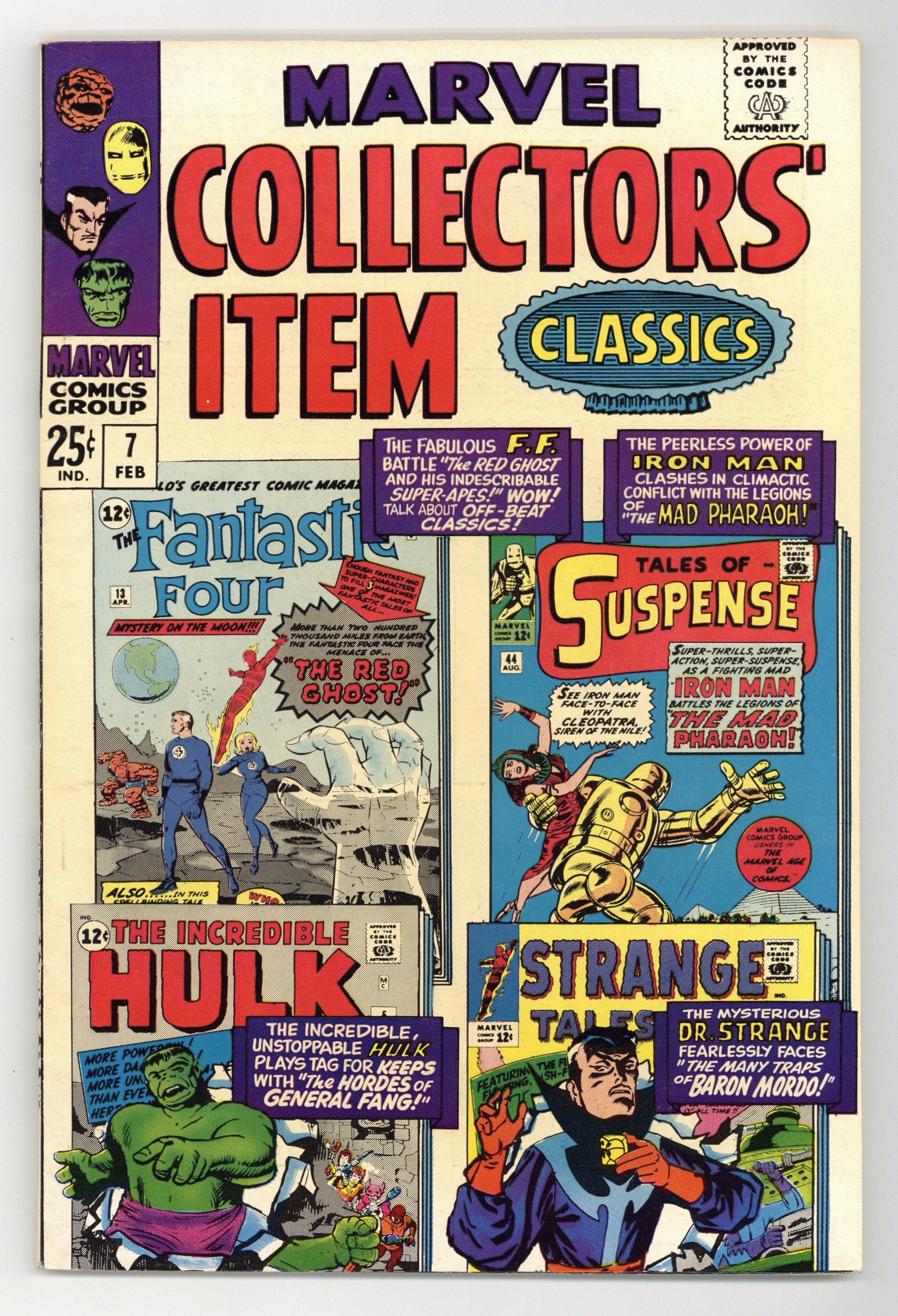 Reprints Fantastic Four #13, Iron Man from Tales of Suspense #44, Incredible Hulk #5 (The Hordes of General Fang), and Doctor Strange from Strange Tales #117. Cover pencils by Jack Kirby (cover repros & Hulk) and Steve Ditko (Dr. Strange), inks by Don Heck? (Fantastic Four cover), Dick Ayers (Tales of Suspense cover & Hulk), and Steve Ditko (Dr. Strange). Reprints Fantastic Four #13, Iron Man from Tales of Suspense #44, Incredible Hulk #5 (The Hordes of General Fang), and Doctor Strange from Strange Tales #117. "The Red Ghost and His Indescribable Super-Apes!", script by Stan Lee, pencils by Jack Kirby, inks by Steve Ditko; While Reed prepares a journey to the Blue Area of the Moon, Ivan Kragoff trains three apes to pilot a spaceship and take possession of the Moon "for the communist empire"; In space, the Fantastic Four's ship crosses that of Ivan Kragoff and they learn of the powers the apes have acquired before landing on the moon; The Watcher appears and explains where he comes from and why he cannot take sides in the battle between the Fantastic Four and the Red Ghost. "The Mad Pharaoh!", script by Stan Lee (plot) and Robert Bernstein (script), art by Don Heck; After waking up from a 2000 years long sleep, Hatap, the Mad Pharaoh, brings Tony Stark into the past to resume his war against Cleopatra. Stark helps Cleopatra defeat Hatap as Iron Man. "The Many Traps of Baron Mordo!", script by Stan Lee, art by Steve Ditko; Mordo places a spell over Doctor Strange's house that causes it to vanish to another dimension. Strange manages to track Mordo down using his ethereal form, but it becomes trapped in Mordo's lair; Mordo goes to see the Ancient One, claiming he's changed his way, just so he can attack him unawares. "The Hordes of General Fang!", script by Stan Lee, pencils by Jack Kirby, inks by Dick Ayers; The Hulk thwarts a would-be Genghis Khan conqueror named General Fang from taking over the Asian province of Llhasa, and he only has to dress up as the Abominable Snowman once to do it. 68 pgs., full color. Cover price $0.25.