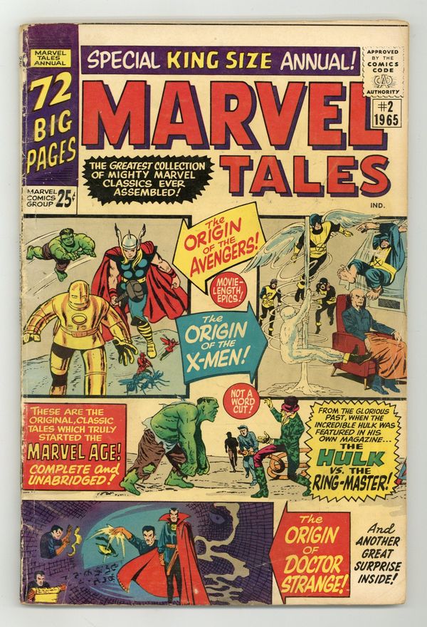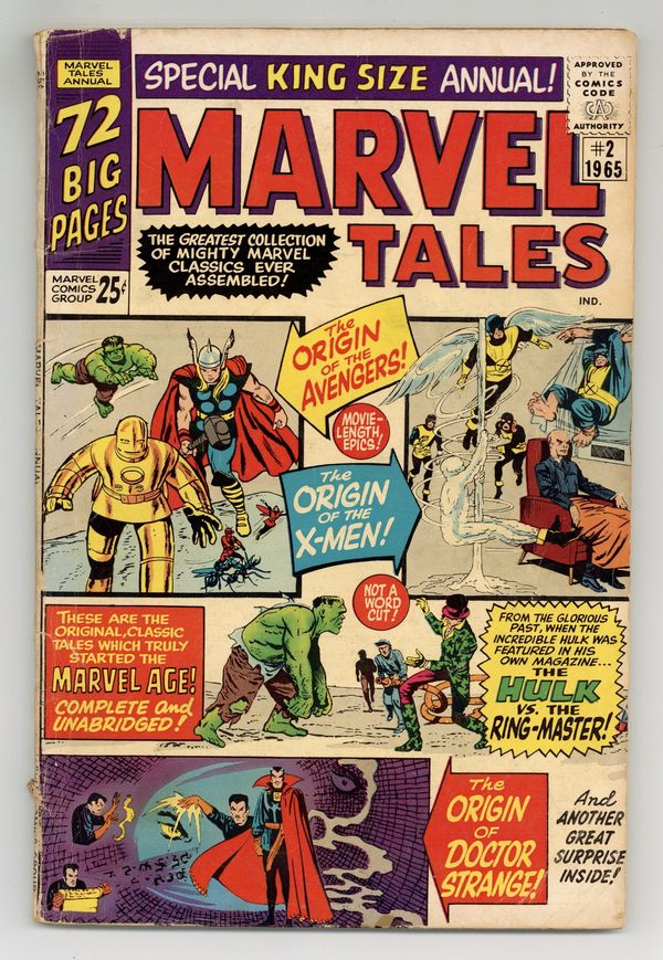 Reprints: X-Men 1, Avengers 1, Strange Tales 115 (Doctor Strange origin), and Hulk 3; Jack Kirby and 72-page giant. All reprints. "X-Men" (script by Stan Lee, pencils by Jack Kirby, inks by Paul Reinman from Uncanny X-Men 1); the Hulk stars in "The Ringmaster" (scripts by Lee, pencils by Kirby, inks by Dick Ayers from Hulk 3); "The Origin of Dr. Strange" (script by Lee, art by Steve Ditko from Strange Tales 115); "The Coming of the Avengers" (script by Lee, pencils by Kirby, inks by Ayers from Avengers 1); and a monster story, "A Monster Among Us" (script by Lee, art by Ditko from Amazing Adult Fantasy 8). Cover price $0.25.