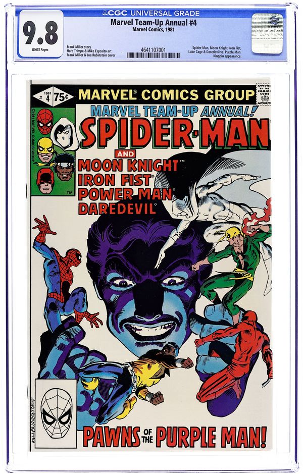 "Power Play!" Guest-starring Spider-Man, Daredevil, Power Man, Iron Fist, and Moon Knight. Script by Frank Miller. Art by Herb Trimpe (breakdowns) and Mike Esposito (finishes). Cover by Frank Miller and Joe Rubinstein. A seemingly harmless traffic accident pits the Purple Man vs. the Kingpin! Why? Because one of the cars involved was transporting a million dollar shipment of illegal drugs! The web-slinger and the Man Without Fear begin the pursuit of Zebediah Killgrave, while the Kingpin plots to destroy New York City's heroes (via the Purple Man) at a big Manhattan charity show! When the Purple Man takes the stage at the convention center chaos erupts! Daredevil and Moon Knight confront the Purple Man; while Spider-Man, Power Man, and Iron Fist take on the rampaging citizens! A fun tale! Cameo appearances by Misty Knight, Colleen Wing, Aunt May, and Debra Whitman. (Notes: The Purple Man previously appeared in Daredevil 154. This issue was reprinted in 1994 in The Complete Frank Miller Spider-Man. This issue contains a full-page ad featuring Spider-Woman and her bi-monthly series. Art by Denys Cowan and Al Milgrom.) 48 pages Cover price $0.75.