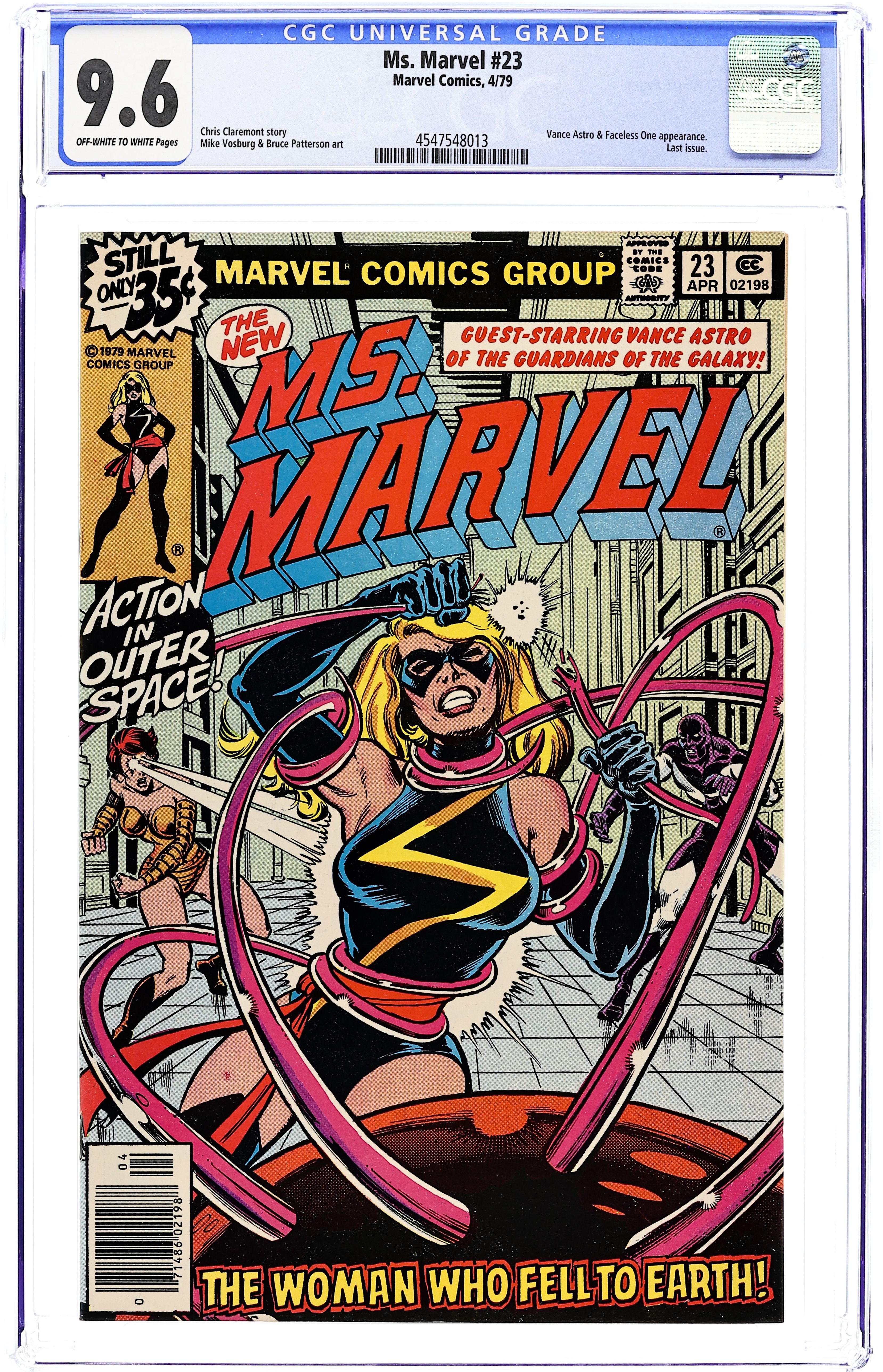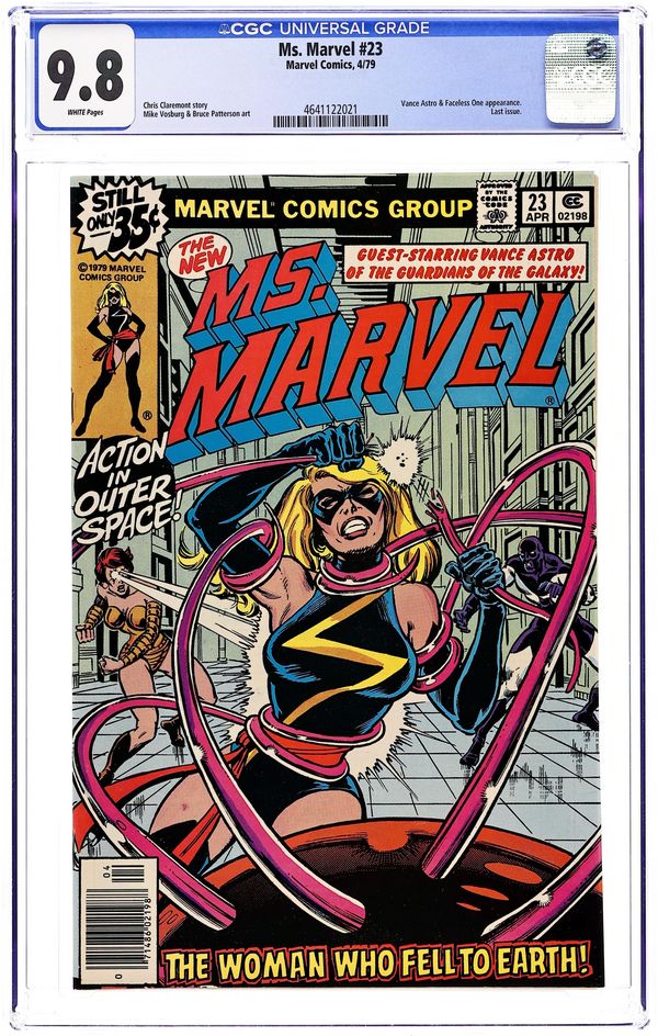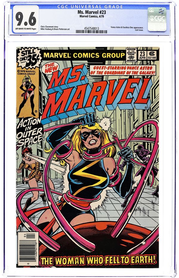 Tags: Marvel Legacy Numbering: Captain Marvel (part 23)$18.00Final issue? See the 1990's title Marvel Super Heroes # 10 & 11 for issues # 24 & 25. George Perez and Joe Rubinstein cover. Chris Claremont script. Mike Vosburg & Bruce Patterson art. "The Woman Who Fell To Earth" Ms. Marvel and Vance Astro of the Guardians of the Galaxy vs. The Faceless One who was last seen in Astonishing Tales #2, (next appearance Avengers #183). Cover price $0.35.