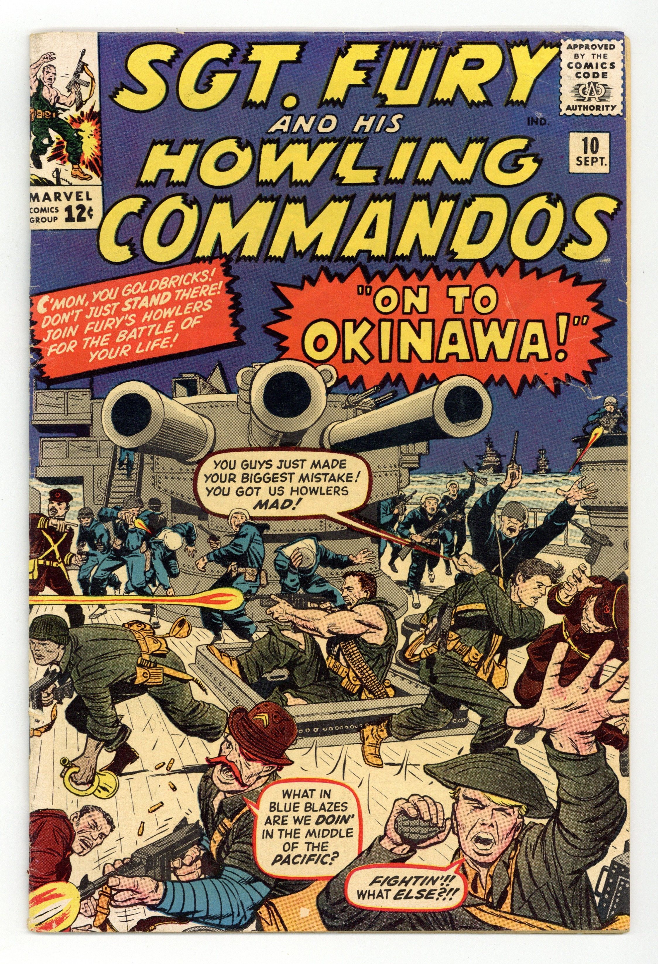 $19.75"On To Okinawa!" Written by Stan Lee. Pencils by Dick Ayers. Inks by George Roussos [as Geo. Bell]. Cover pencils by Jack Kirby with inks by Dick Ayers. The Howling Commandos are sent to Okinawa to rescue Colonel Parker from a Japanese prison. Notes: First appearance of Captain Savage (as the Skipper). Letter to the editor from comics artist Dave Cockrum. Cover price $0.12.