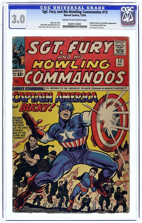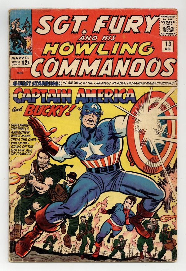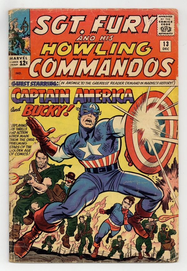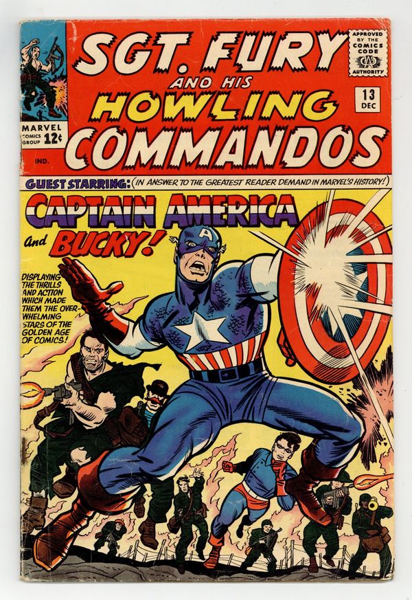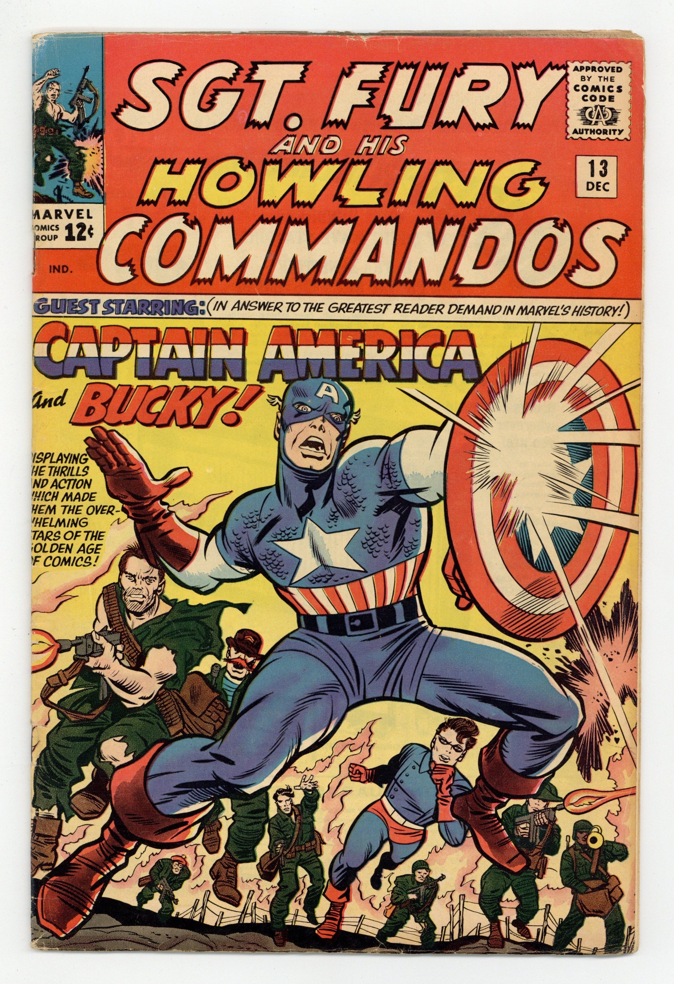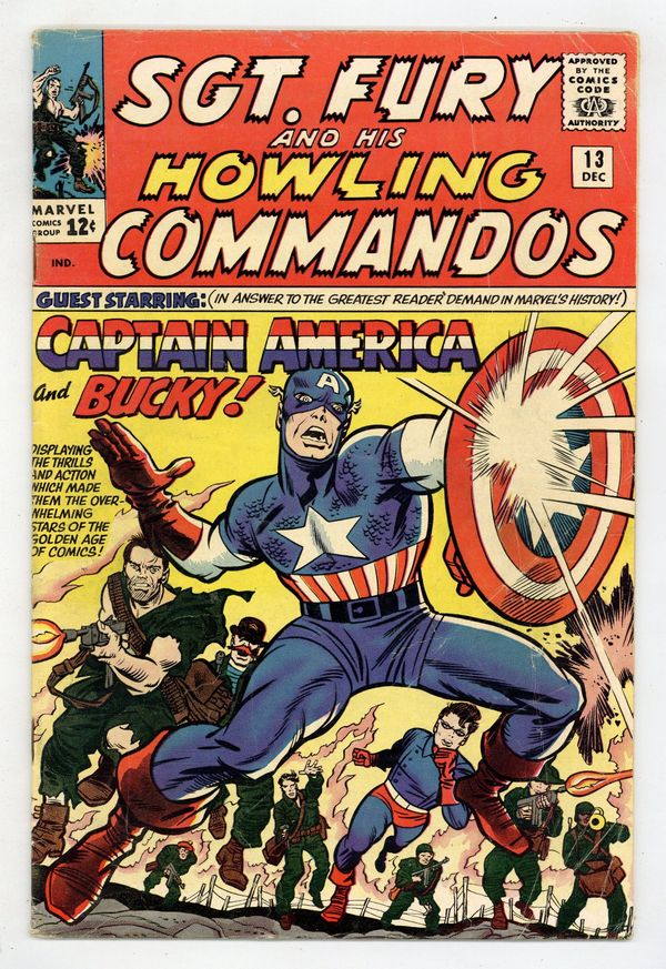 1st printing. Captain America and Bucky guest star in "Fighting Side-By-Side With Captain America and Bucky!" This is the second solo Captain America crossover outside of the Avengers. Script by Stan Lee, pencils by Jack Kirby, inks by Dick Ayers. Kirby cover pencils. NOTE: 1994 JC Penney reprint exists. Can be identified by having a Bic ad on the back cover. 36 pages, full color. Cover price $0.12.