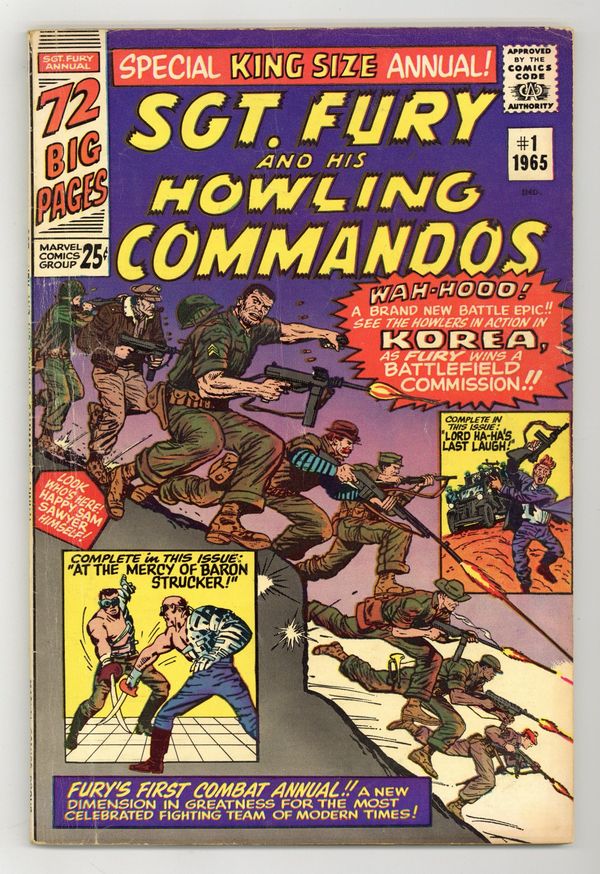 $16.5072-page giant. New story: "Commission in Korea!" Script by Stan Lee, pencils by Dick Ayers, inks by Frank Giacoia (as "Frankie Ray"). 4-page feature, "Meet the Howling Commandos" (pencils by Kirby?). Reprints: "Lord Ha-Ha's Last Laugh" (from Sgt. Fury 4) and "At the Mercy of Baron Stucker" (from issue 5). Scripts by Lee, pencils by Kirby, inks by George Roussos (as "George Bell"), plus Jack Kirby reprints from Sgt. Fury 4 and 5. Cover price $0.25.