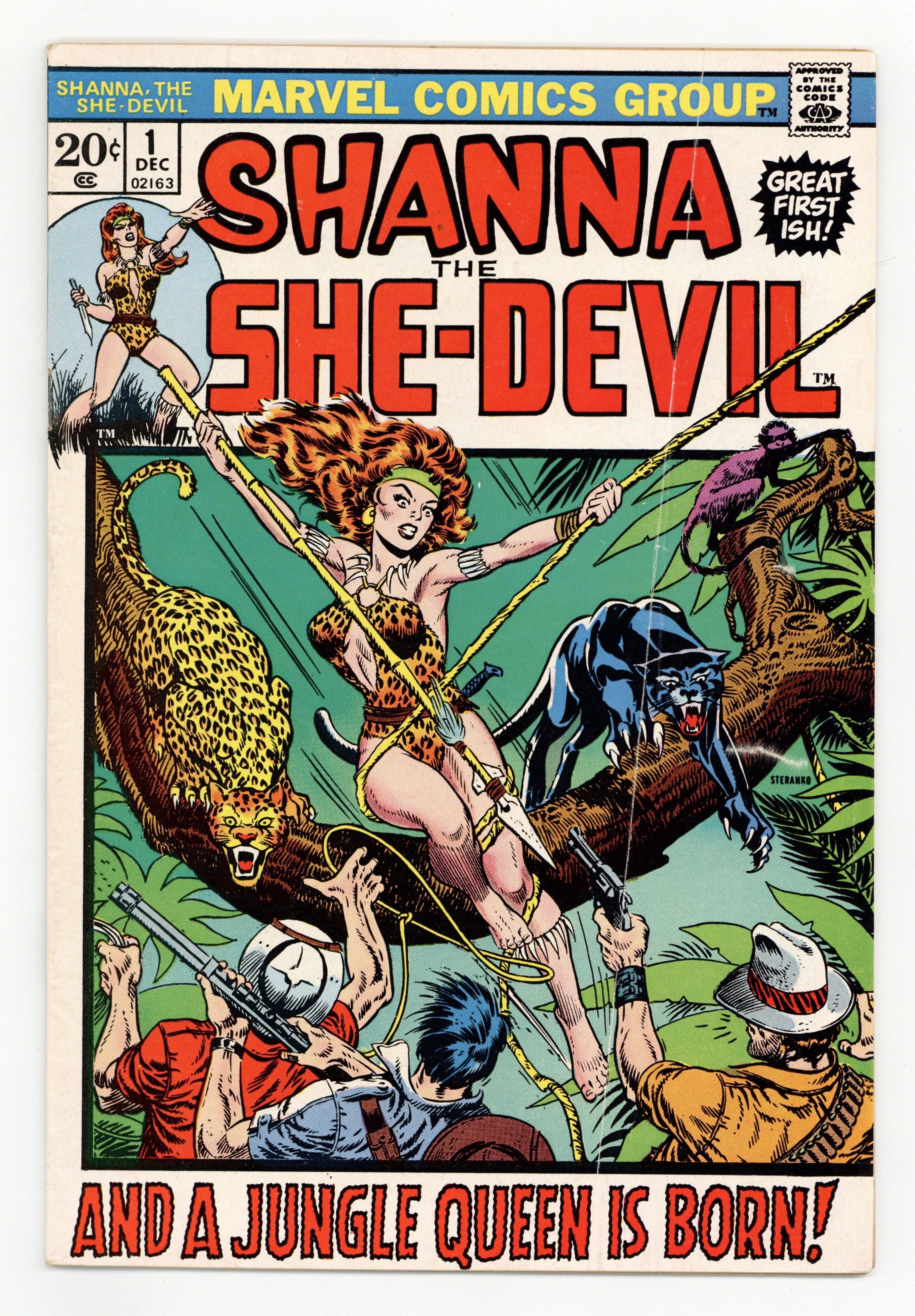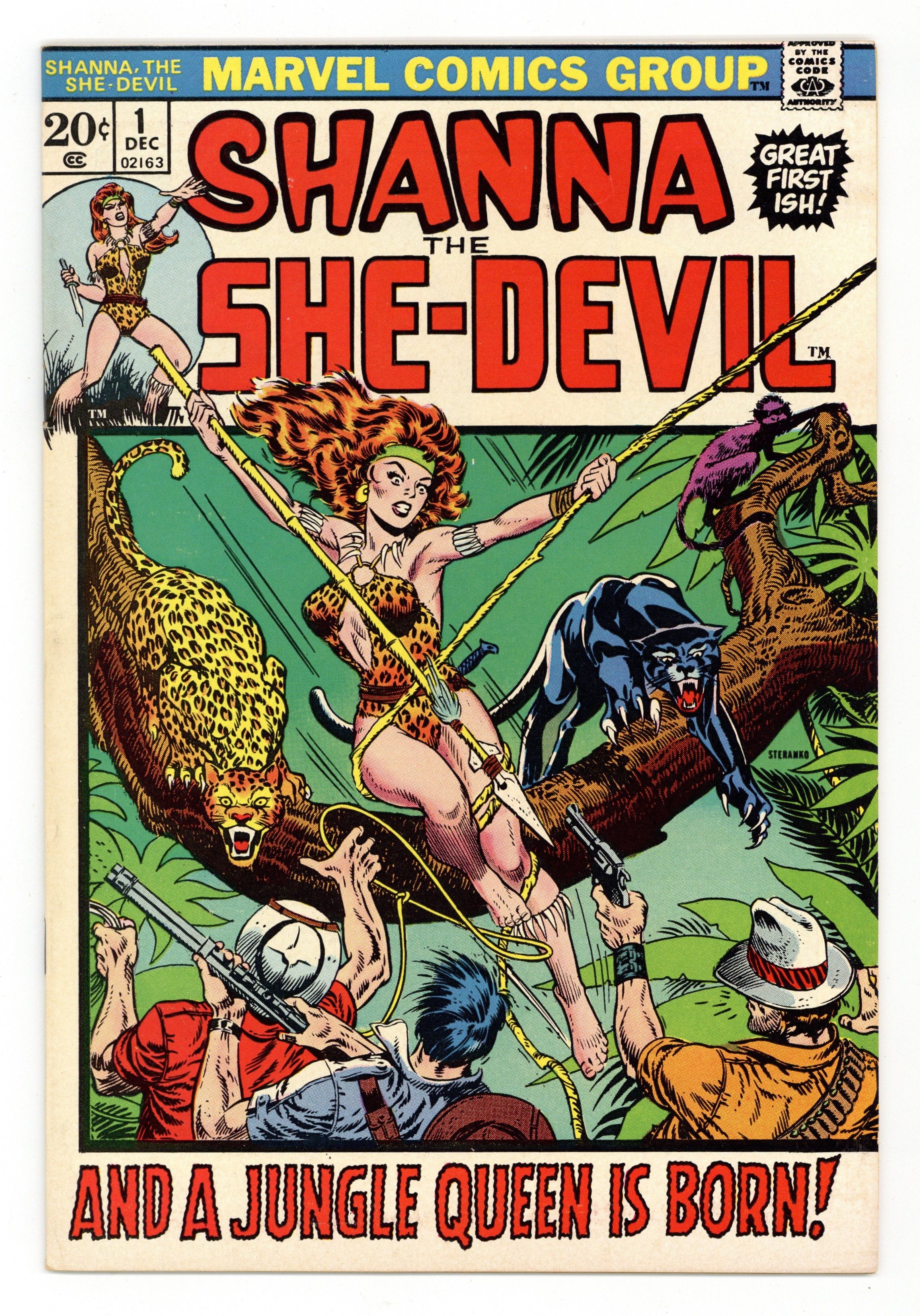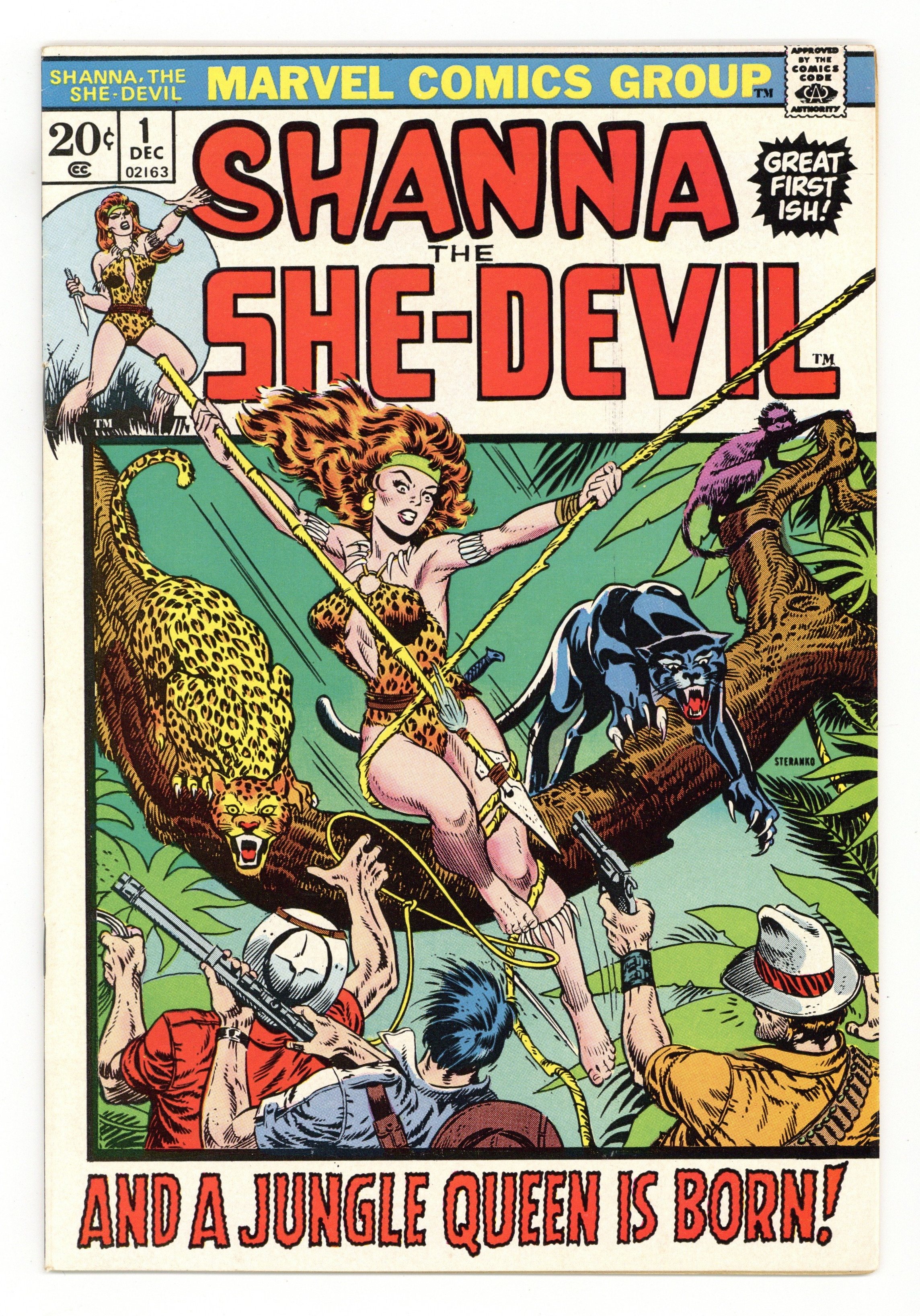 Cover art by Jim Steranko. "Shanna the She-Devil!", script by Carole Seuling and Steve Gerber, pencils by George Tuska, inks by Vince Colletta; The origin of Shanna; Shanna O'Hara Plunder is the daughter of a diamond miner; Born in Africa, she spent her childhood in the jungles of Zaire; After Shanna's father accidentally kills her mother, Shanna moves back to the United States to live with relatives, and Shanna grows up to become an accomplished athlete and then becomes a zoologist; She returns to Africa and patrols the jungle living freely with the land. 36 pgs., full color. Cover price $0.20.