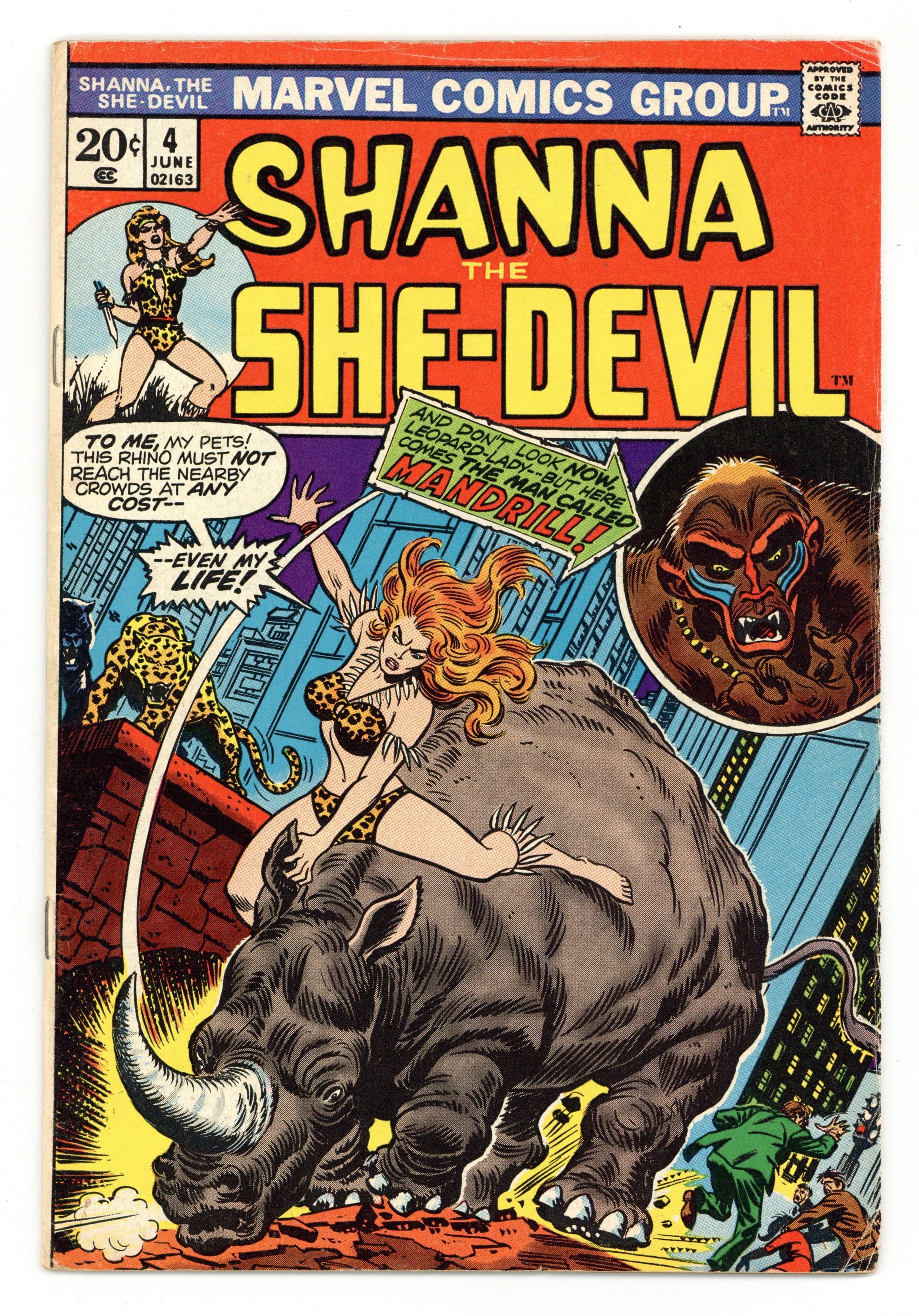Cover art by John Romita. "Cry Mandrill," script by Carole Seuling (plot) and Steve Gerber (script), pencils by Ross Andru, inks by Vince Colletta; Shanna's upscale dinner with her jungle cats goes horribly awry when the mind-enslaving Mandrill shows up for the main course; Mandrill's first appearance! 36 pgs., full color. Cover price $0.20.