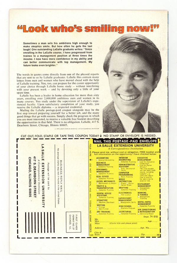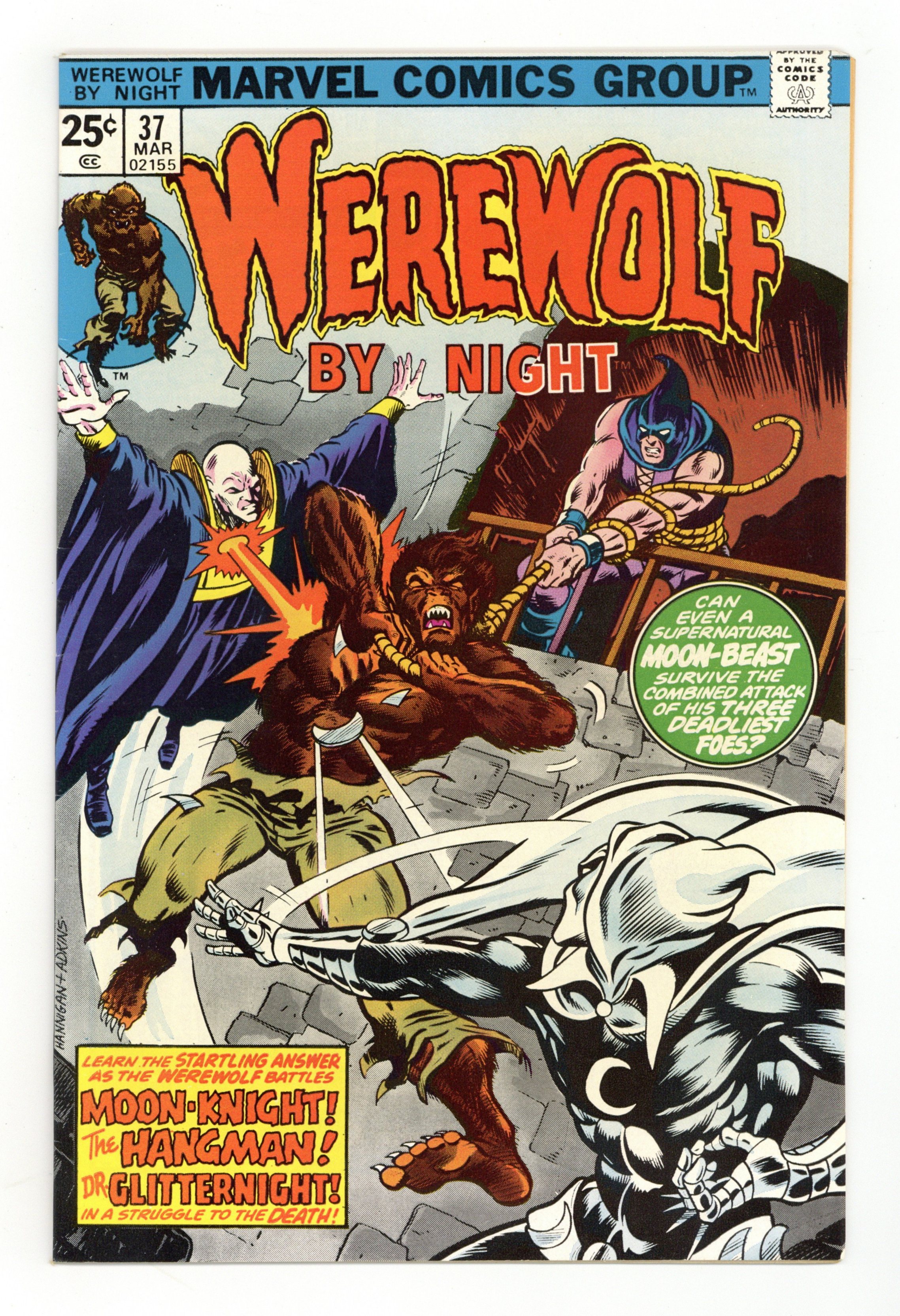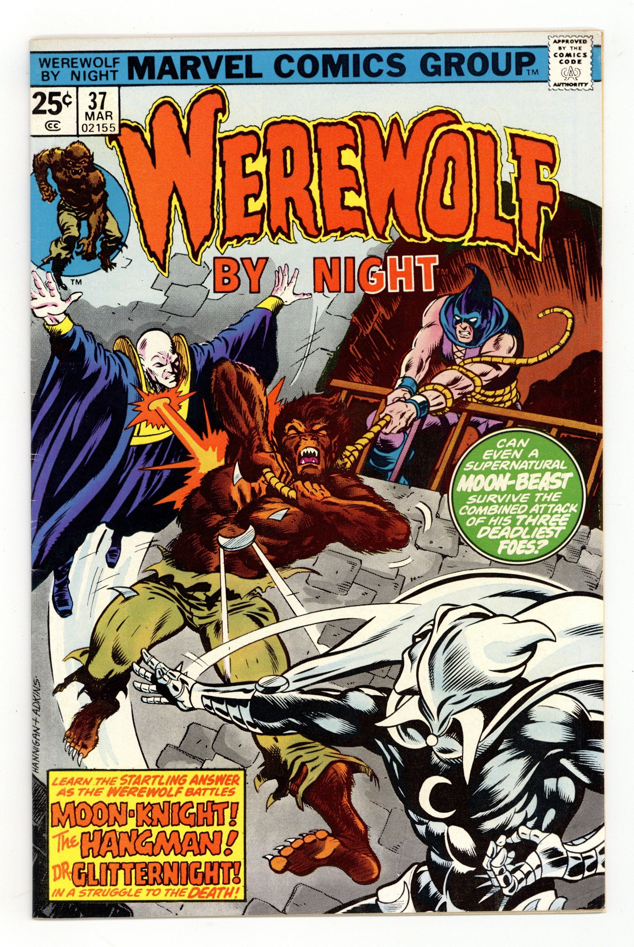 "Final Ending!" Guest-starring Moon Knight. Written by Doug Moench. Art by Don Perlin. Can even the werewolf survive the combined assault of his three deadliest foes - Moon Knight, the Hangman, and Dr. Glitternight?! This is it! Everything the past 36 issues of Werewolf by Night have been building up to comes to a head! Don't miss the stunning, soul-chilling conclusion! 32 pages, FC. Cover price $0.25.