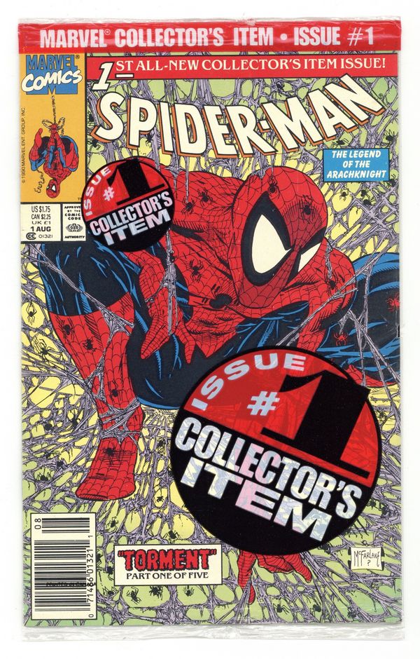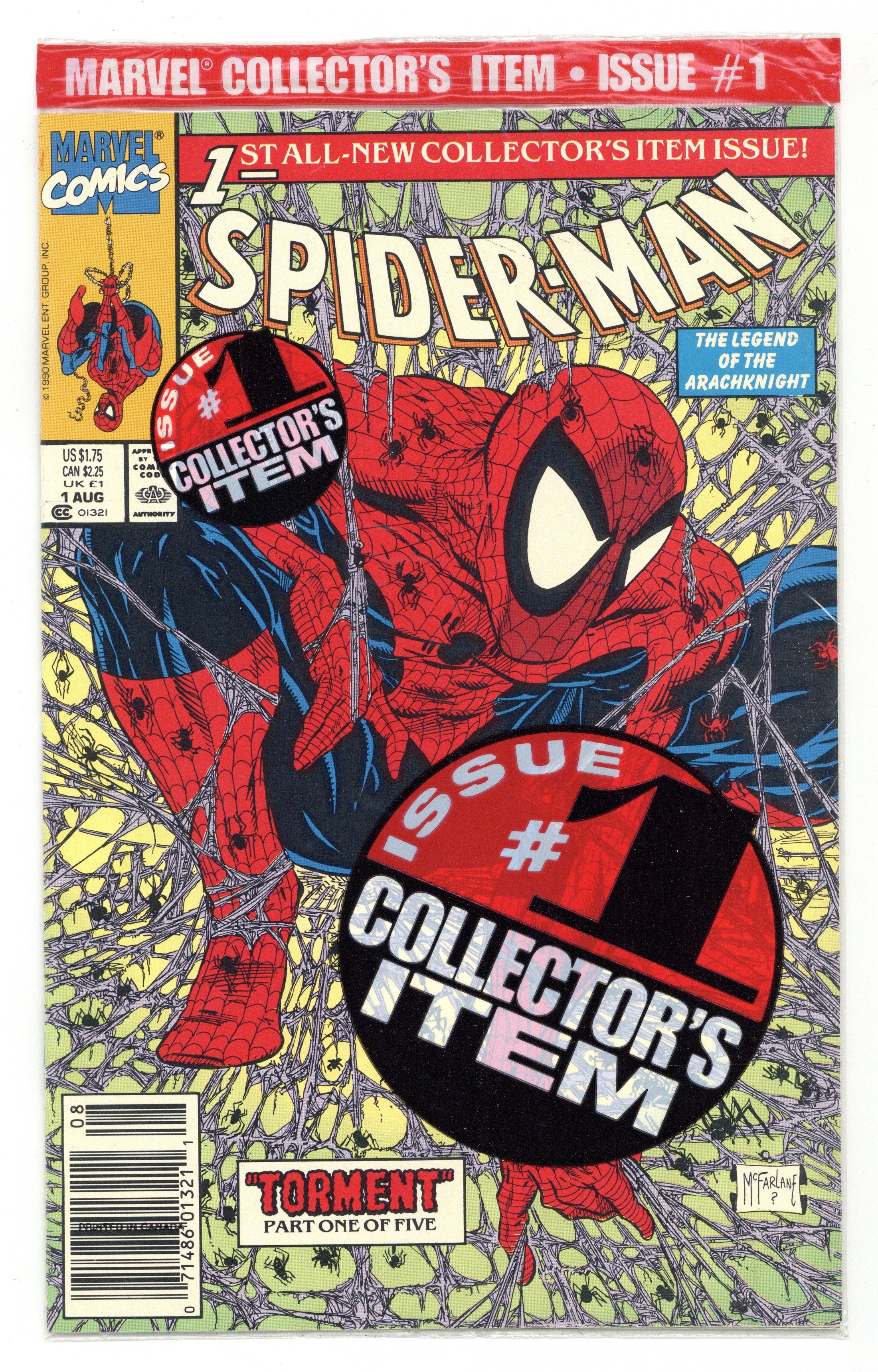 Polybagged, barcode on cover. Torment: Part 1 of 5. Story, art and cover by Todd McFarlane. Fresh off his legendary run on Amazing Spider-Man, super-star artist Todd McFarlane is given the reigns to his very own Spidey title. Right out of the gate the wall-crawler will be challenged like never before as mysterious and ominous drums in the distance are driving the savage Lizard to cut a swath of death and destruction through the streets of New York City. Can Spider-Man discover the one responsible for this madness before his arch foe causes more damage? NOTE: Webbing on cover may be grey or purple. Cover price $1.75.