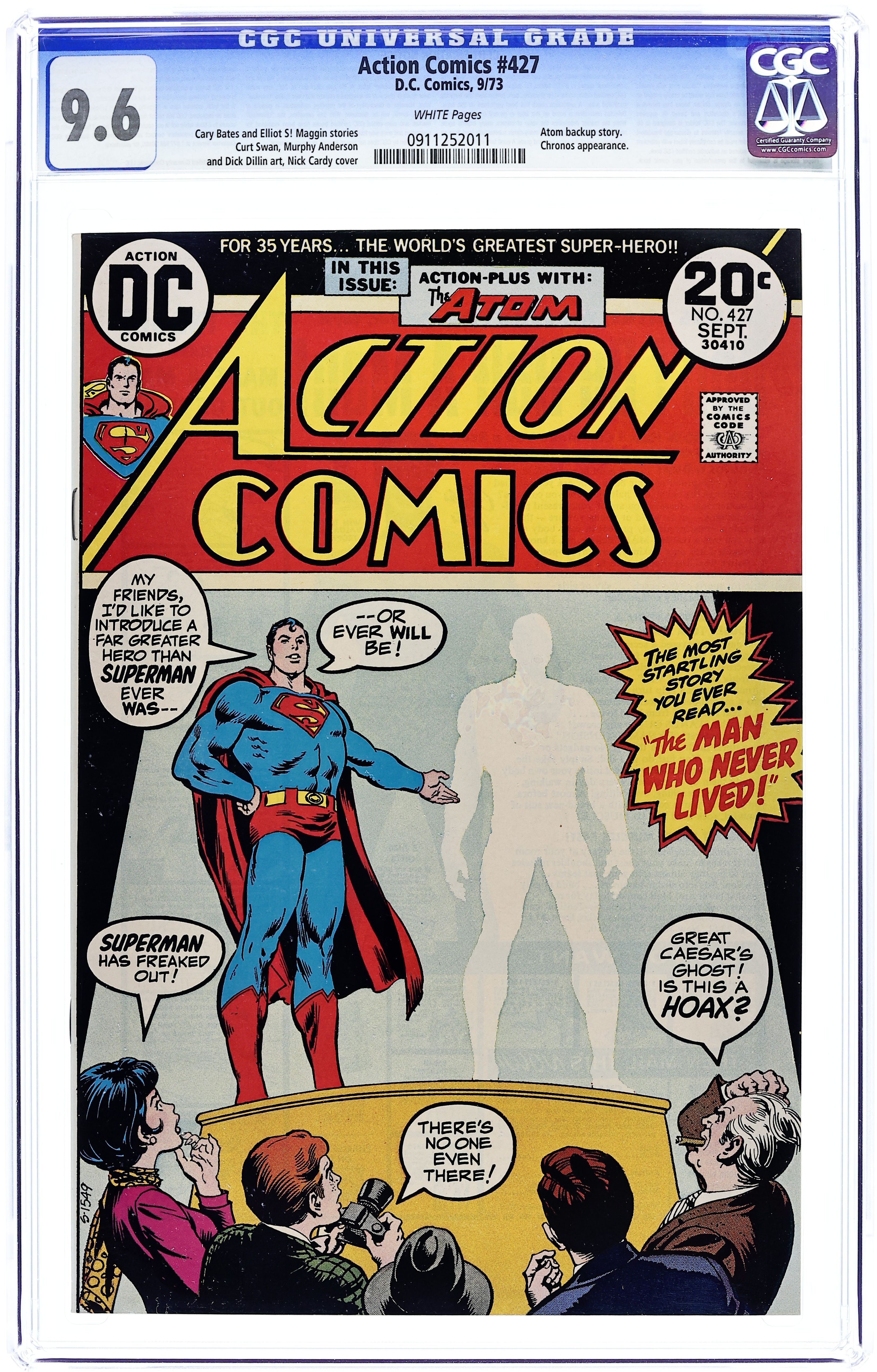 Cover by Nick Cardy. "The Man Who Never Lived!", script by Cary Bates, pencils by Curt Swan, inks by Murphy Anderson; A programmed assassin of the 21st Century sets in motion a plan for an ancestor of his to encounter Superman and prevent his future existence. "The Time Thief Strikes But Once!", script by Elliot S! Maggin, pencils by Dick Dillin, inks by Dick Giordano; Chronos breaks jail and issues a challenge to the Atom to try and stop his next crime before he can commit murder. Letter to the editor from comics writer Bob Rozakis. 36 Pages, Full Color. $0.20 Cover price $0.20.