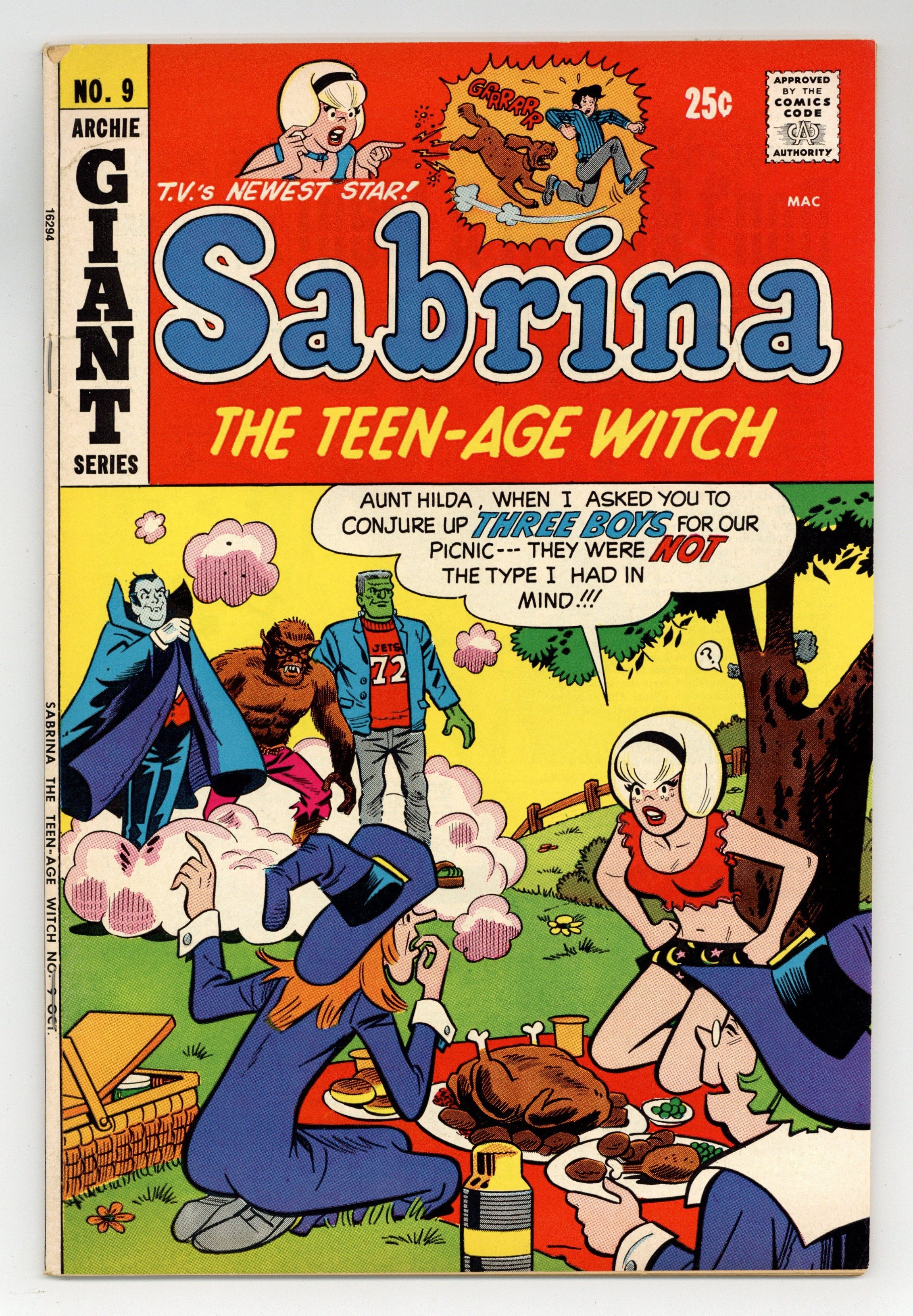 Cover pencils by Dan DeCarlo, inks by Rudy Lapick. Those Were the Days My Friend! starring Sabrina, script by Dick Malmgren, pencils by Al Hartley, inks by Joe Sinnott; Della brings over Priscilla Prudence, a witch who has lost touch with the way things have changed since her day back in 17th-century Salem. I Think I Can starring Aunt Hilda, pencils by Al Hartley, inks by Joe Sinnott. This Little Piggy Went To Market starring Sabrina, script by Dick Malmgren, pencils by Bill Vigoda. Witches Are Only Human! starring Sabrina, Aunt Hilda, and Cousin Ambrose, script by Frank Doyle, pencils by Al Hartley, inks by Joe Sinnott. 52 pgs. $0.25. Cover price $0.25.