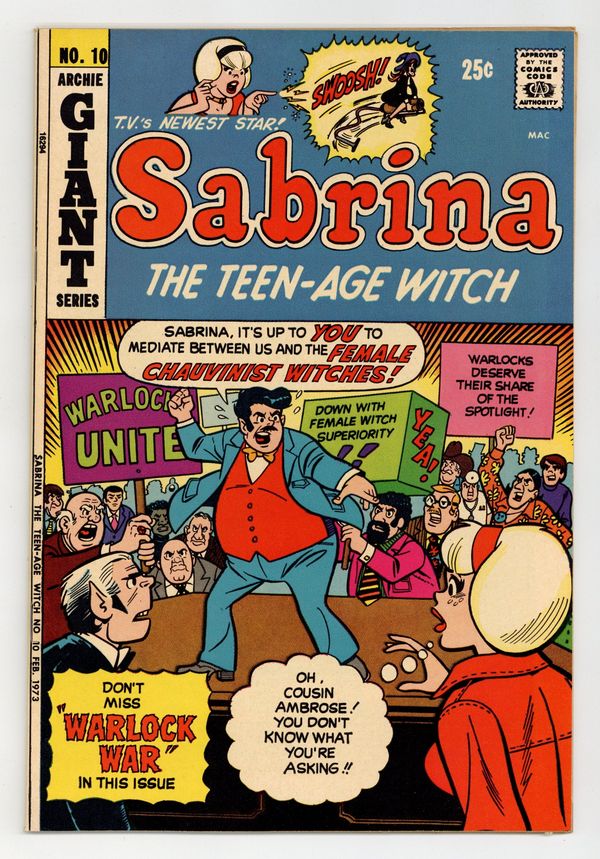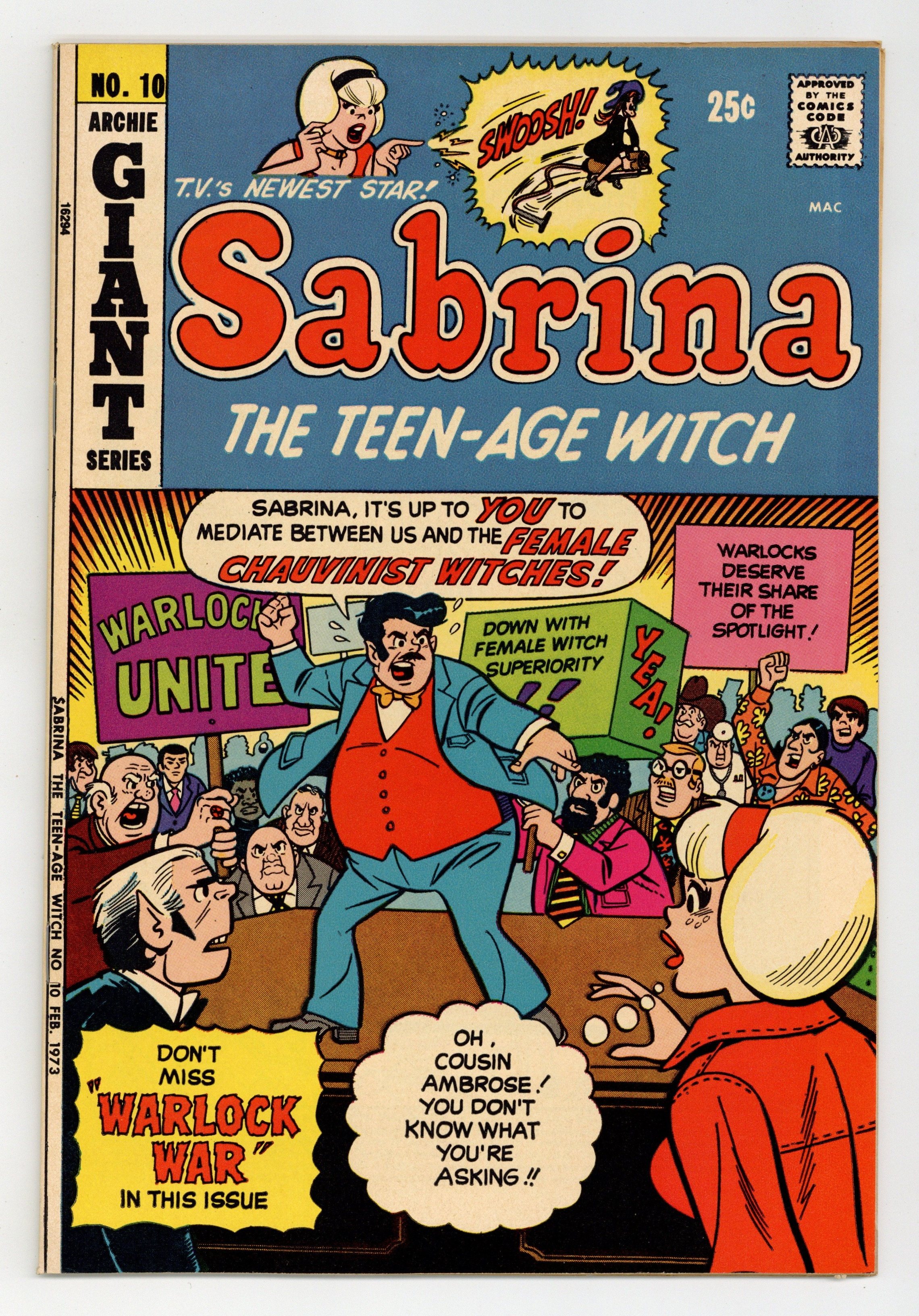 Cover pencils by Dan DeCarlo, inks by Rudy Lapick. A Spell of Shoveling starring Sabrina and Aunt Hilda, script by Frank Doyle, pencils by Dan DeCarlo, inks by Rudy Lapick; a man sees Sabrina magically making snow disappear, and wants to get her into show business. Zippity Zap starring Sabrina, script by Frank Doyle, pencils by Stan Goldberg, inks by Jon D'Agostino. Warlock War starring Sabrina, Cousin Ambrose, Aunt Hilda, Archie Andrews, Jughead Jones, and Veronica Lodge, script by Frank Doyle, pencils by Dan DeCarlo, inks by Rudy Lapick. 52 pgs. $0.25. Cover price $0.25.