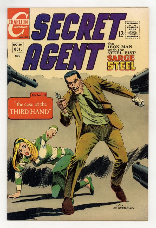 Published Oct 1967 by Charlton Comics Group.$14.00Cover by Dick Giordano. Stories and art by Jim Aparo, Steve Skeates, Dave Kaler, and Dick Giordano. A tough-guy secret agent with a robotic right hand, Sarge Steel is a Cold War hero like they don't make any more. On a date with Linda, Sarge is fired upon by an unknown assailant, and soon realizes Linda was the real target. Agent Tiffany Sinn, who gets her assignments through a secret radio hidden in her lipstick, pursues kidnappers in a foreign capital. This story features early art by future Batman artist Jim Aparo. File #113: The Case of the Third Hand; Tiffany Sinn, the CIA Sweetheart: Espionage: Muscle Beach Style. Final issue of the series. 32 pages, Full Color. Cover price $0.12.