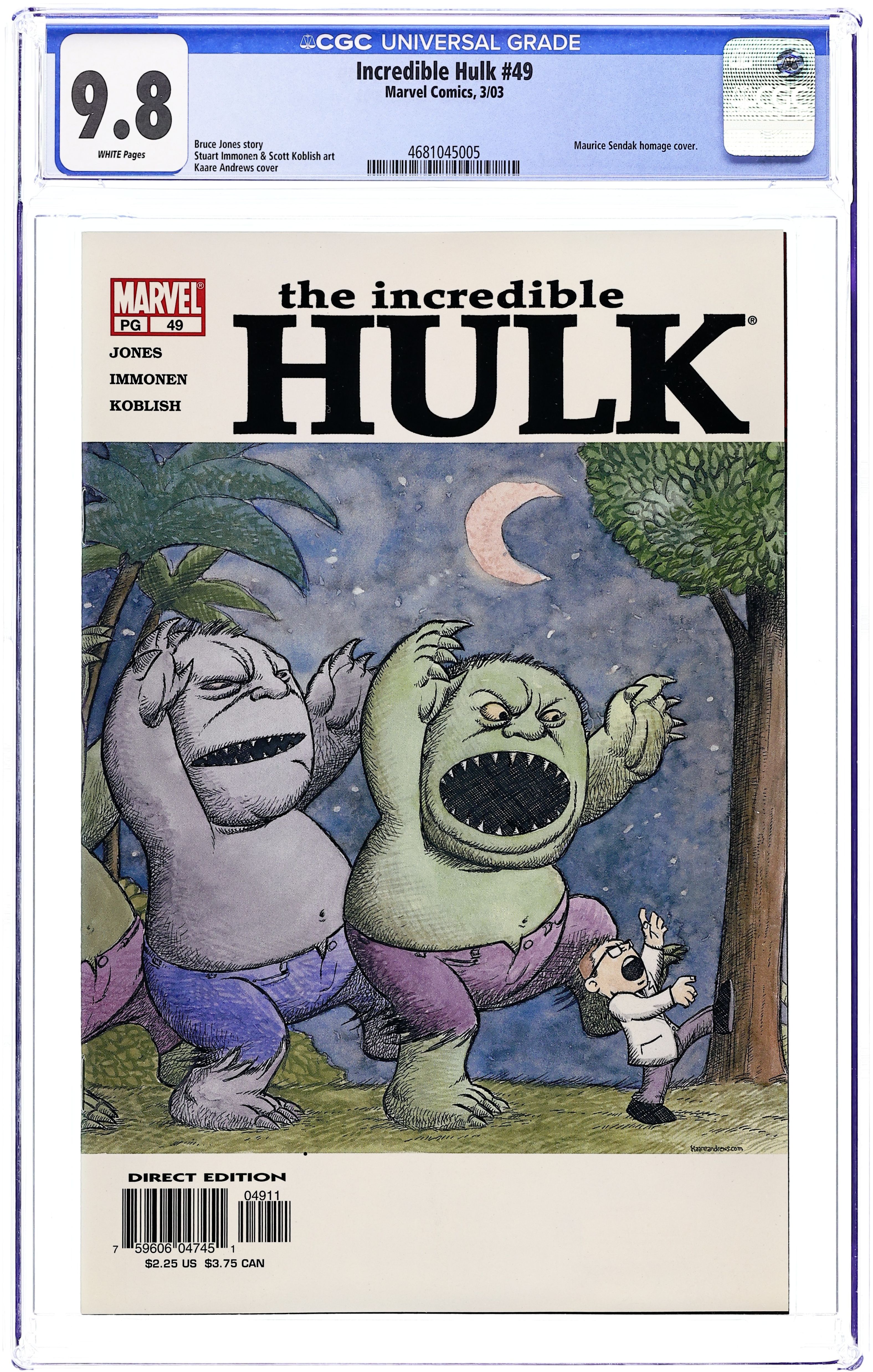 Cover by Kaare Andrews. "Pratt Fall," script by Bruce Jones, pencils by Stuart Immonen, inks by Scott Koblish; The Hulk (with Bruce's mind) kills Agent Pratt. 36 pgs., full color. $2.25. Cover price $2.25.