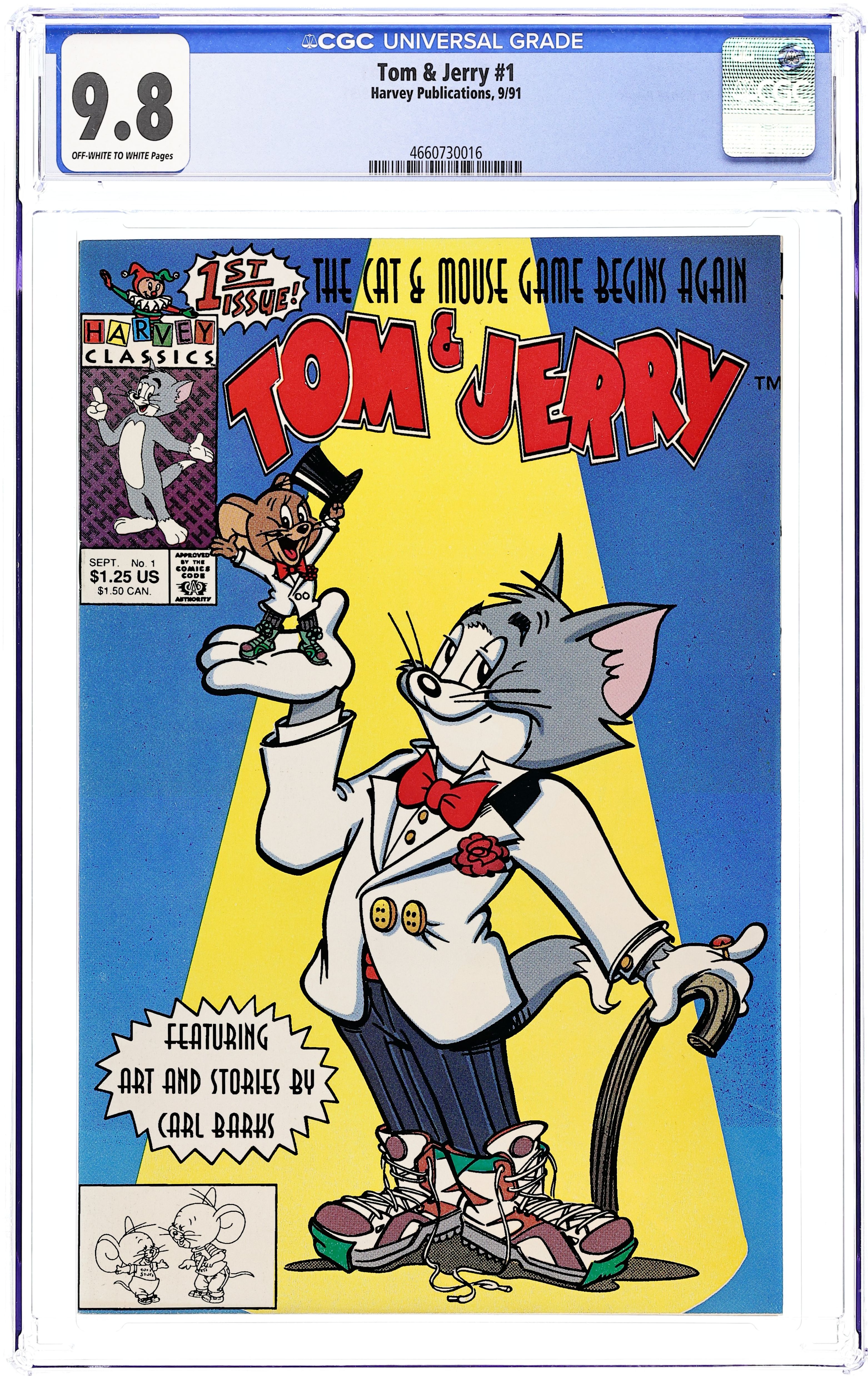 Direct Edition. Stories and art by Oscar Martin, Jack Bradbury and Carl Barks. As part of Harvey Comics' revival in the early 1990s, they reprinted classic comics starring eternal combatants Tom & Jerry. This series boasted little-known Barney and Benny stories from comics legend Carl Barks. Jerry gets a reprieve while Tom goes crazy looking for Missy. In a classic gag, Barney and Benny return from moose-hunting, but the moose they bring home is only unconscious, not dead. Barney and Benny are confused by reducing pills and a visit from Mooseface's skinny brother. Tom & Jerry; Barney Bear and Benny Burro. 32 pages, Full Color. Cover price $1.25.