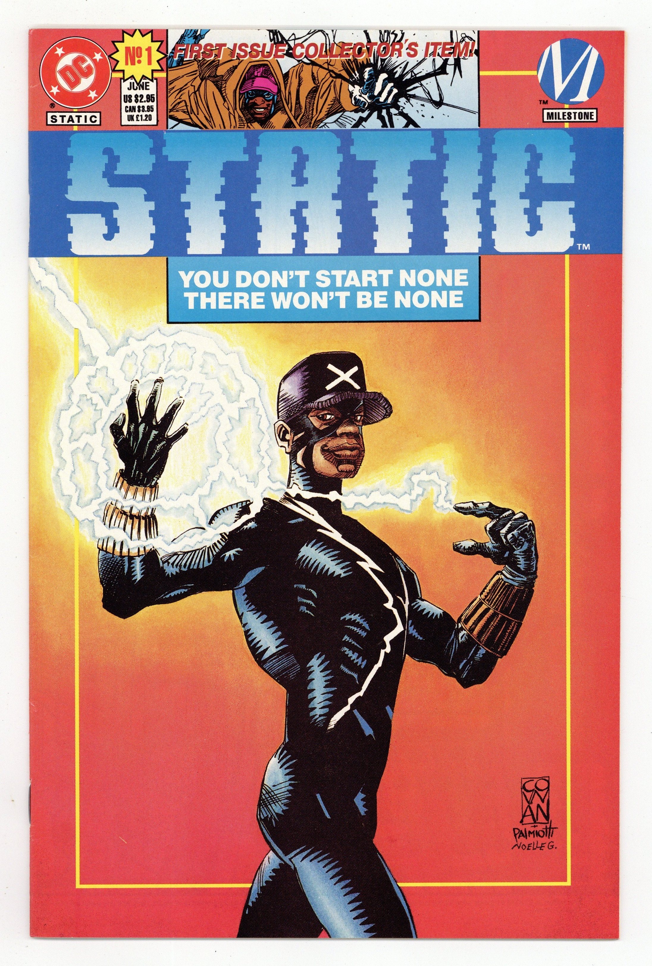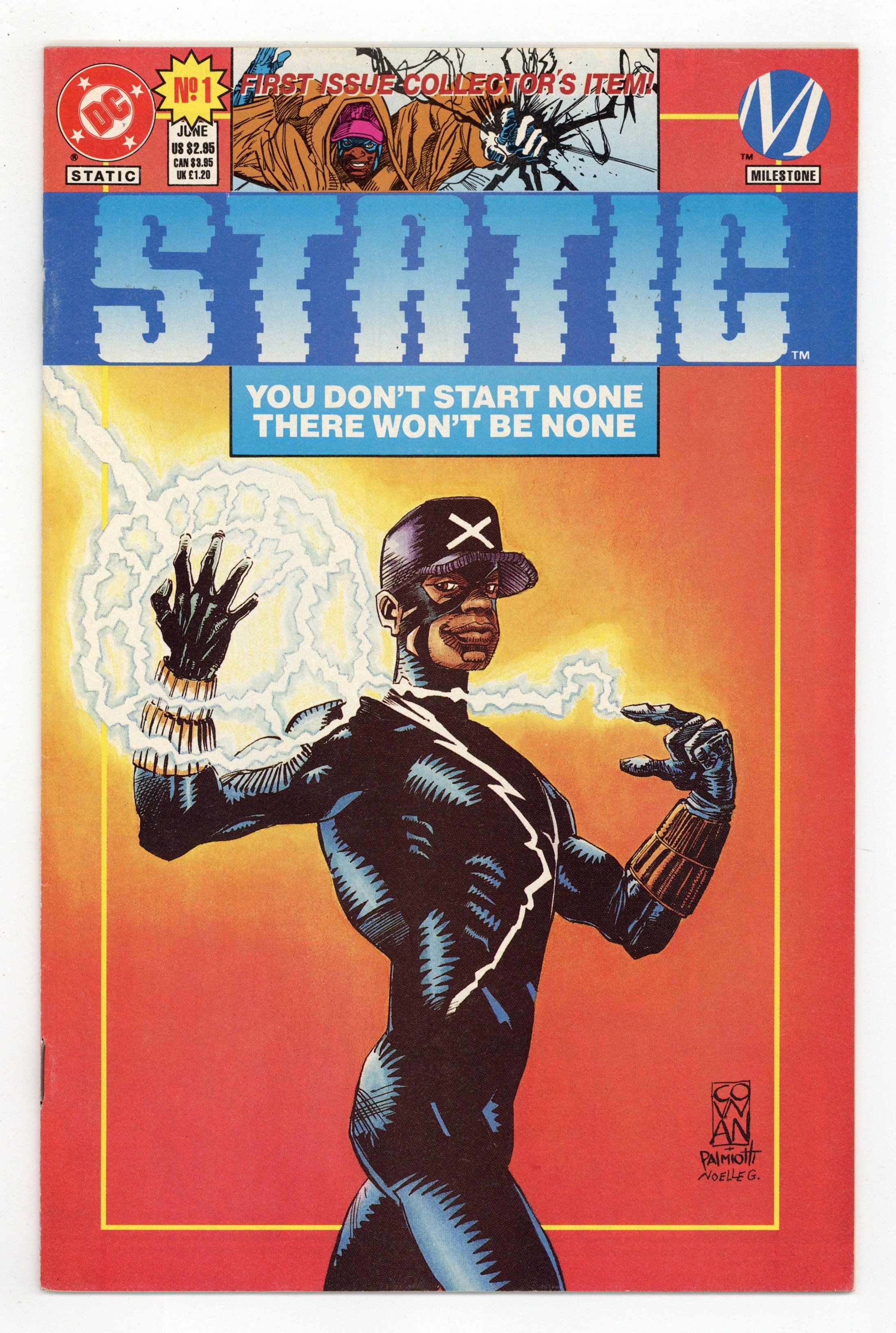 Direct Edition unbagged without extras. Cover by Denys Cowan and Jimmy Palmiotti. Burning Sensation [Trial by Fire, Chapter One], script by Dwayne McDuffie and Robert L. Washington III, art by John Paul Leon and Steve Mitchell; Frieda goes to Akkad's place where the five alarm crew is waiting to take her somewhere; Static steps in and defeats them; Frieda goes home; Virgil asks Larry about asking Frieda out; Larry says he thinks Frieda believes they're just friends; the five alarm crew take Frieda to Hot-Streak; Static battles Hot-Streak, but when he sees his face he stops fighting and is defeated en by him. 36 pgs., full color. $2.95. Cover price $2.95.