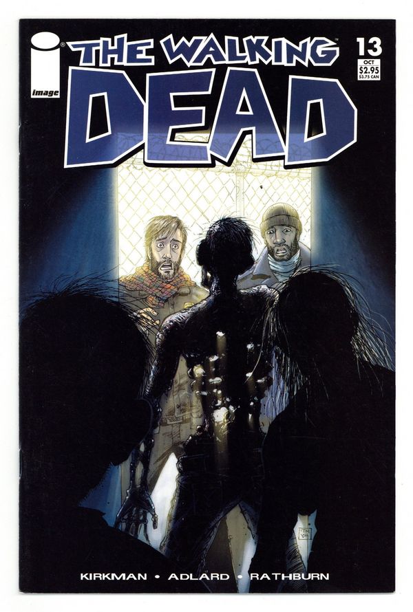 $32.00On sale 10.06 $2.95 monthly ongoing miniseries black & white, 32 pages written by ROBERT KIRKMAN art by CHARLIE ADLARD cover by TONY MOORE CONCEPT: An epidemic of apocalyptic proportions has swept the globe, causing the dead to rise and feed on the living. In a matter of months society has crumbled: There is no government, no grocery stores, no mail delivery, no cable TV. In a world ruled by the dead, we are forced to finally begin living. THIS ISSUE: The epic tale of survival continues as Rick and crew find another possible shelter. This place is perfect: It's secure, it's large, it has nearly everything they could ever need. Only problem is, it's already got dead tenants...lots of 'em. MATURE READERS WARNING Cover price $2.95.