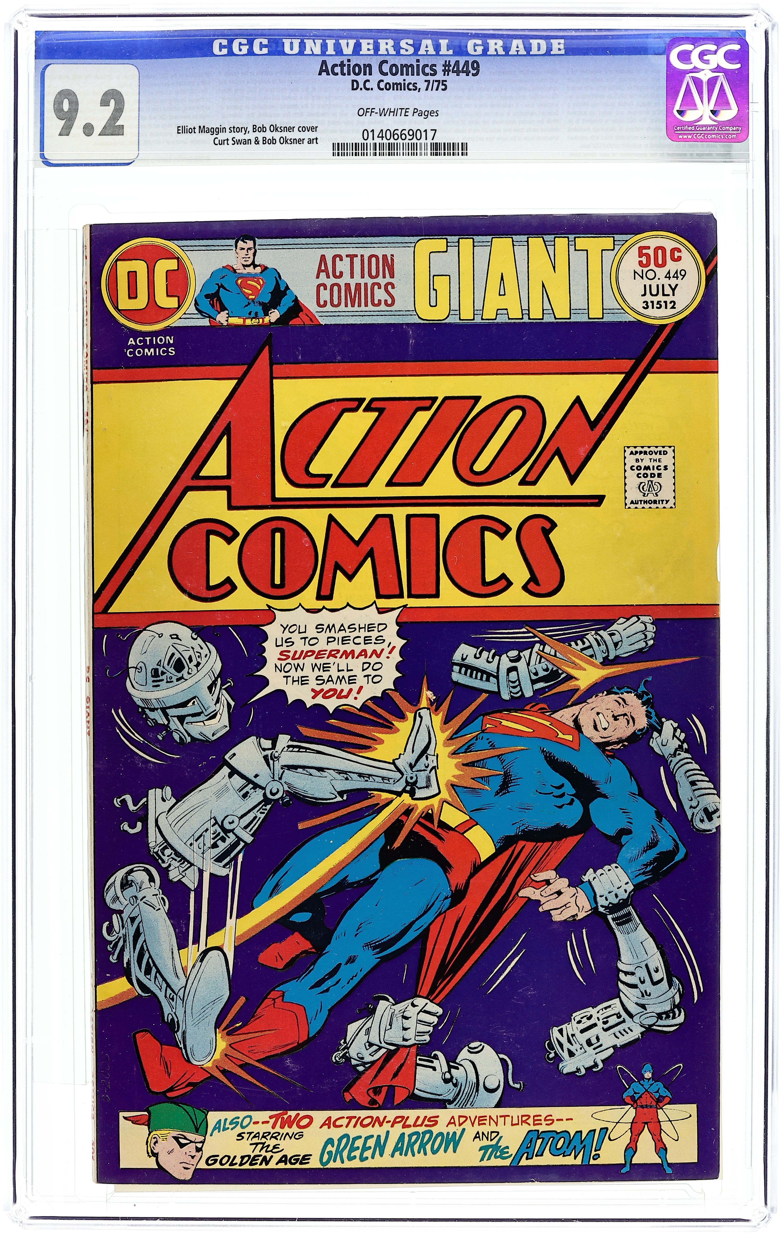 Cover by Bob Oksner. "My Best Friend - The Super-Spy!", script by Elliot S! Maggin, pencils by Curt Swan, inks by Bob Oksner; The enemy agent inside Galaxy Communications uses androids against Superman. "The Mystery of the Giant Arrows," script by France Herron (possibly plotted by Jack Kirby), pencils by Jack Kirby, inks by Jack Kirby and Roz Kirby (backgrounds); Green Arrow and Speedy investigate giant arrows falling from the sky and are pulled into an alternate dimension where they meet Xeen Arrow. "Green Arrow's Amazing Arsenal!" two-page story. "The Atomic Flea!" starring the Atom, script by Gardner Fox, pencils by Gil Kane, inks by Sid Greene. 68 Pages, Full Color. Cover price $0.50.