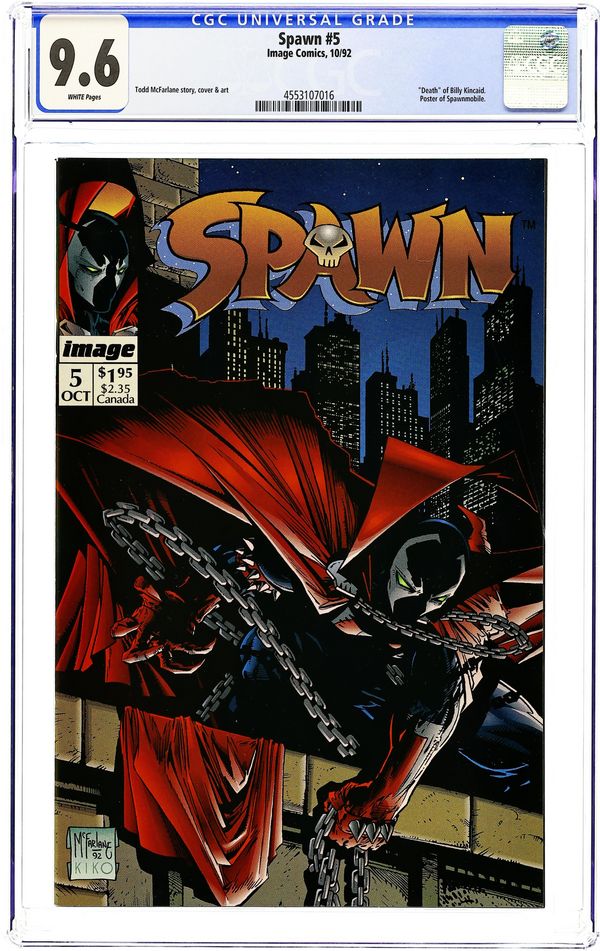 Direct Edition (has no bar code on cover). "Justice!". Created, story, and art by Todd McFarlane. Billy Kincaid is convicted child killer. When he is released back into society, how long before he reverts to his sick twisted ways? This time though, it is not a failed justice system that Kincaid will have to face. He'll have to face the justice of Spawn! Includes a 2-page pin-up by Jason Pearson. Spawn Mobile pull out centerfold photo poster. NOTE: To the best of our knowledge, a limited amount of copies were packaged inside a Limited Edition Hot Wheels Spawn Mobile Toy and once removed from the Hot Wheels package, it is indistinguishable from the rest of the print run. Cover price $1.95.