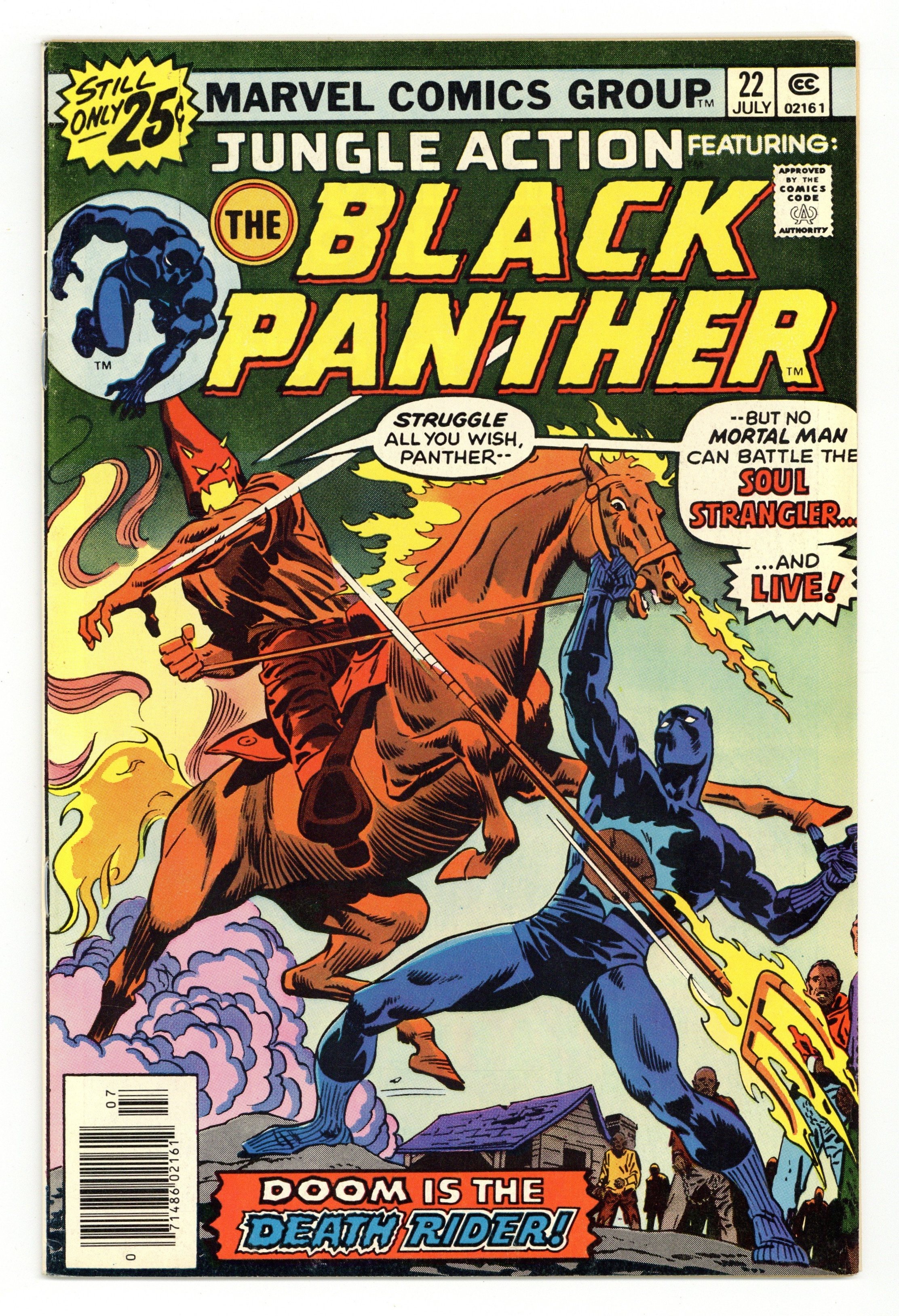 Cover pencils by Rich Buckler, inks by Frank Giacoia. The Black Panther stars in the Panther versus the Klan part 4, "Death Riders on the Horizon, script by Don McGregor, pencils by Billy Graham (pages 1-5) and Rich Buckler (pages 6-17), inks by Bob McLeod (pages 1-5) and Jim Mooney (pages 6-17); Monica's mother tells a story of Klan raid during Reconstruction and Monica re-imagines it with the Panther present. Letters from comics creators John Rieber and Glenn Rowsam. 36 pgs., full color. Cover price $0.25.