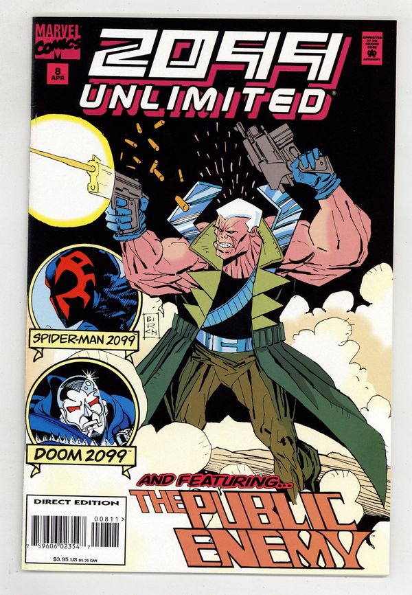 $15.00Cover art by Joe Brozowski (as J.J. Birch). "Public Enemy Number One," script by Pat Mills and Tony Skinner, pencils by Malcolm Davis, inks by Chris Ivy; Public Enemy tries to move on from his mission, but when he sees a corrupt republic all around him, he can't resist fighting back; But that gets the attention of White Dog the Public Defender; Public Enemy stops White Dog, who killed all of the other Red Dogs like Public Enemy. "Behind the Eight Ball," script by Terry Kavanagh, art by Max Douglas; Spider-Man 2099 battles the Data Pirate; The Data Pirate steals to feed his family - or does he? "Rumors of War," script and art by Ernie Colon; Doom disguises himself and goes among his people; There he learns one of his generals has launched an ethnic war against the gypsies Doom himself was borne from; In turn, he learns of a legendary hero who defends the gypsies; But not all is as it seems. 68 pgs., full color. Cover price $3.95.
