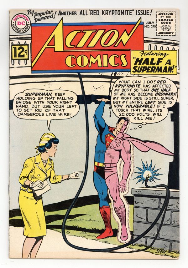 Cover pencils by Curt Swan and Kurt Schaffenberger (Lois Lane figure touch-up), inks by George Klein. "Half a Superman!", pencils by Curt Swan, inks by George Klein; Red Kryptonite particles in a comet cause Superman's left side, and Krypto's right side, to become vulnerable; unfortunately, it's on a day when Lois wants to prove that Superman is really Clark. Batman and Robin ad. Lois Lane ad. Supermen of America ad. 1st Supergirl emergency squad in "Supergirl's Super Boy-Friends!", script by Jerry Siegel, art by Jim Mooney; A gift from Phantom Girl is unfortunately made from Red Kryptonite, which makes Supergirl bestow super-powers on her mother, Dick, and Jerro when she kisses them. Superman ad. 36 Pages, Full Color. $0.12 Cover price $0.12.