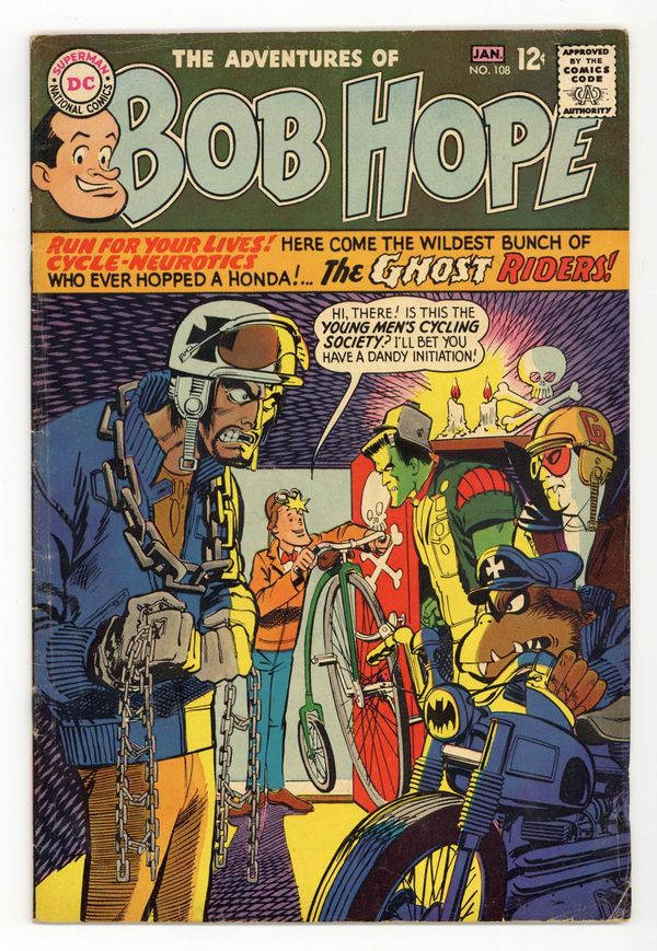 Cover art by Neal Adams. The Ghost Riders of Gasoline Gulch! starring Bob Hope and Super-Hip, script by Arnold Drake, art by Neal Adams; Tad goes undercover in a motorcycle gang in order to aid the police. Ad for Mattel's Major Matt Mason line of toys. Comic strip pin-up house ad for Teen Beat magazine. House ad for Challengers of the Unknown #59. House ad for G.I. Combat #127. House ad for Superman #202. 32 pgs. Cover price $0.12.
