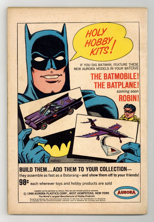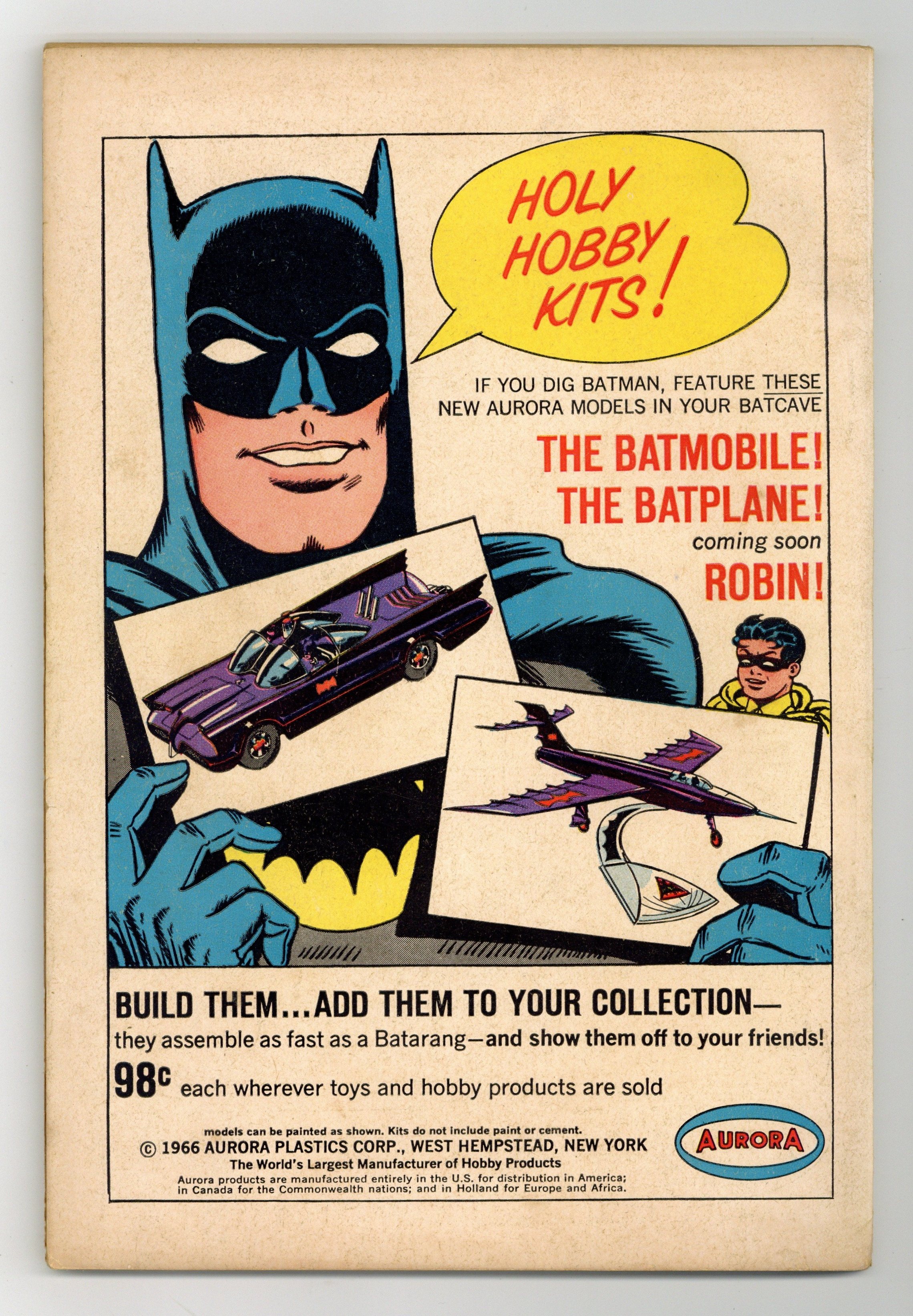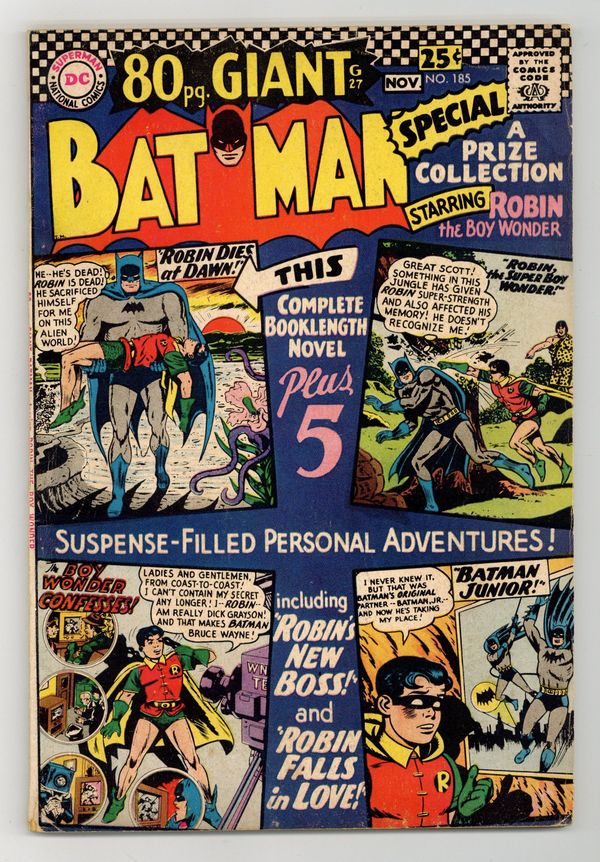 Reprints, 80-page giant. Cover pencils by Sheldon Moldoff, Curt Swan, and Jim Mooney, inks by Stan Kaye, Sheldon Moldoff, and Charles Paris. "Batman, Junior" (from Detective Comics 231), script by Edmond Hamilton, pencils by Sheldon Moldoff, inks by Charles Paris; When Batman doesn't allow Robin to come with him on a case, he's hurt, but more so when he accidently discovers a photo of the Caped Crusader with a younger version of himself taken years before there was a Robin. "Robin Falls in Love" (from Batman 107), script by Bill Finger, pencils by Sheldon Moldoff inks by Charles Paris; Robin falls hard for a lovely young skater after saving her life...a romance that causes problems for Batman in their daily crime fighting chores! "Robin's New Boss" (from Batman 137), script by Bill Finger, pencils by Sheldon Moldoff, inks by Charles Paris; Robin informs Batman that he is quitting the team to join up with a new crime fighter on the scene, Mr. Marvel, although Batman doesn't suspect the real reason why. "Robin, the Super Boy Wonder" (from Batman 150), script by Bill Finger, art by Jim Mooney; When the Dynamic Duo are forced down over the Yucatan Plateau during a storm, Batman, accused of stealing emeralds from a native tribe, is shocked to learn that his partner no longer remembers him and has acquired super powers! "The Boy Wonder Confesses!" (from Batman 81), script by David Vern, pencils by Sheldon Moldoff, inks by Stan Kaye; When Dick is late to school one morning, he is asked by his teacher why...and he tells them that he was out catching a crook as Robin the Boy Wonder....then goes outside and proves it! "The Secret of the Ant-Man" (from Batman 156), script by Bill Finger, pencils by Sheldon Moldoff, inks by Charles Paris; After Batman announces that he is going away on a secret Government mission, a pint-sized crime fighter by the name of Ant-Man pops up to help him out, but the Boy Wonder wrongly guesses that it is Batman in disguise. "Robin Dies at Dawn" (from Batman 156), script by Bill Finger, pencils by Sheldon Moldoff, inks by Charles Paris; Batman undergoes a test simulation for a situation that astronauts may one day face alone in outer space, and during that simulation he sees Robin dies. Inside front cover contains a photo ad for the 1966 Batman feature film. 84 Pages, Full Color. Cover price $0.12.