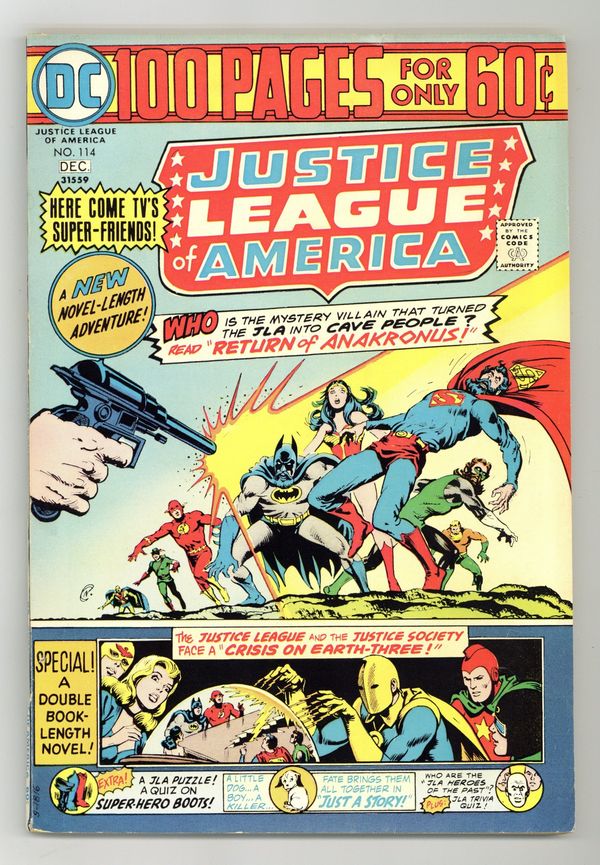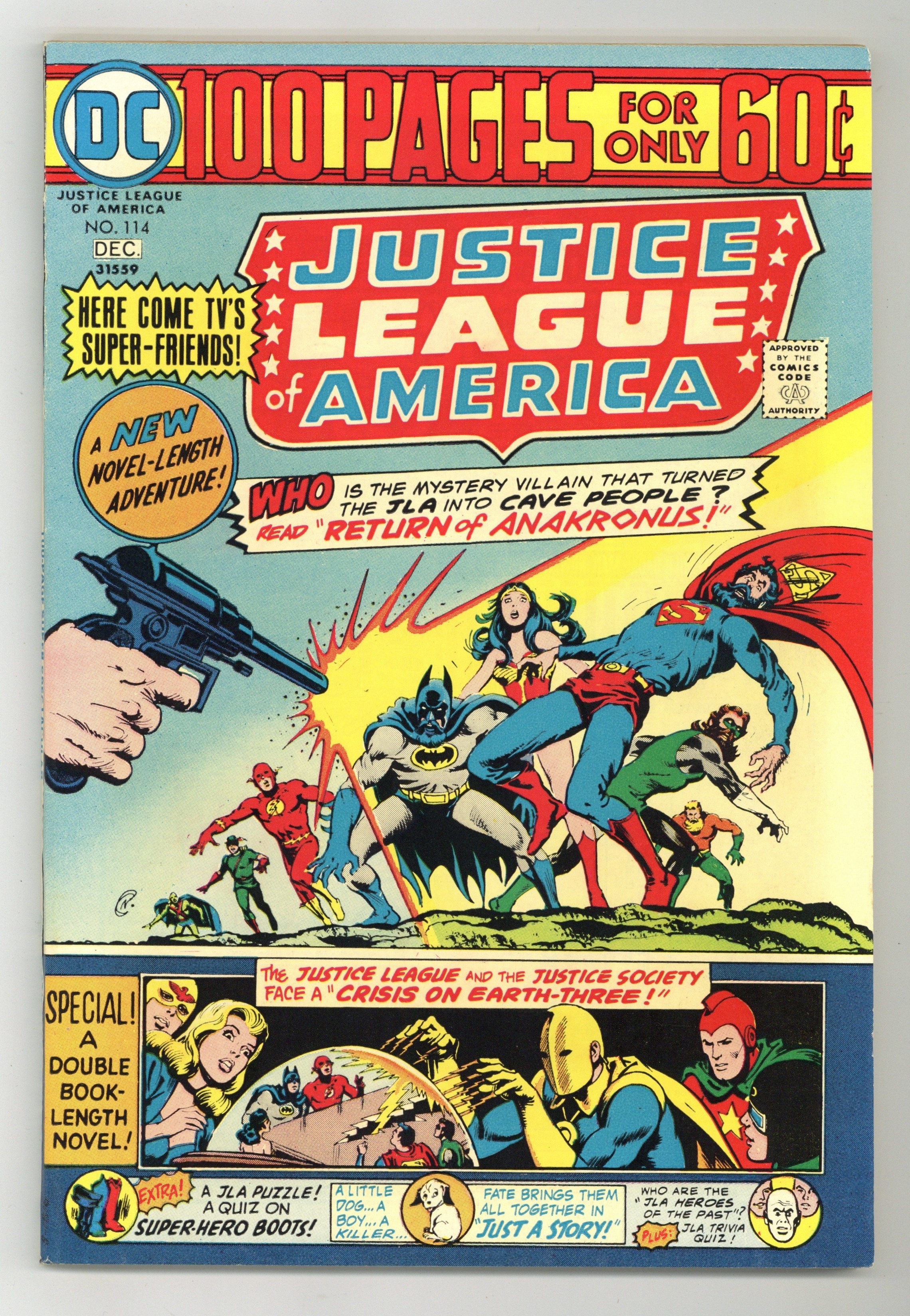 Cover art by Nick Cardy. The Return of Anakronus!, script by Len Wein and Mark Hanerfeld [as Felton Marcus], pencils by Dick Dillin, inks by Dick Giordano; Snapper Carr creates a fictional story in which the JLA faces the unstoppable menace of Anakronis, and it's up to them to figure out how to defeat him. Detour--Just a Story starring Hawkman, script and art by Howard Purcell. Super-Hero Boots! activity page, art by Mike Sekowsky, Curt Swan, and Neal Adams. JLA Trivia Quiz. Crisis on Earth-Three! starring the Justice League of America, script by Gardner Fox, pencils by Mike Sekowsky, inks by Bernard Sachs. Cover price $0.60.