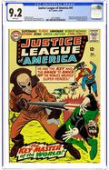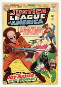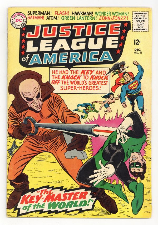 $15.00Cover pencils by Mike Sekowsky, inks by Murphy Anderson. Builders of the Future! public service announcement, art by Sheldon Moldoff. The Key-Master of the World!, script by Gardner Fox, pencils by Mike Sekowsky, inks by Bernard Sachs; The Key administers a psycho-chemical to the JLA which forces them to disband and become unable to see his henchmen commit robberies; However, they are returned to normal when Hawkgirl discovers the situation, and go on to defeat The Key. Notes field: Hawkman uses the Absorbascon to discover the secret identities of the JLA members. Cap's Hobby Center by Henry Boltinoff. Cover price $0.12.