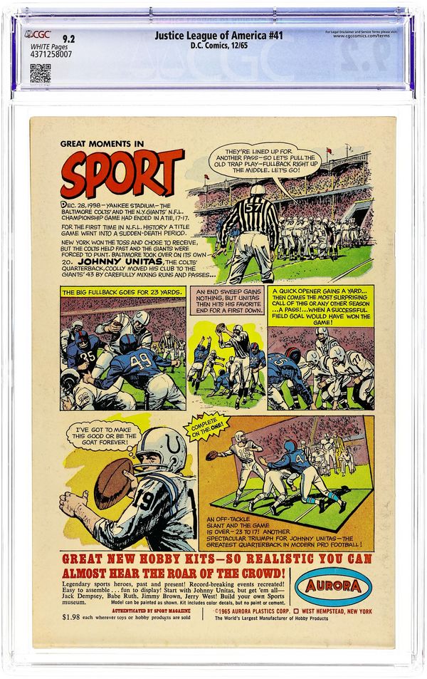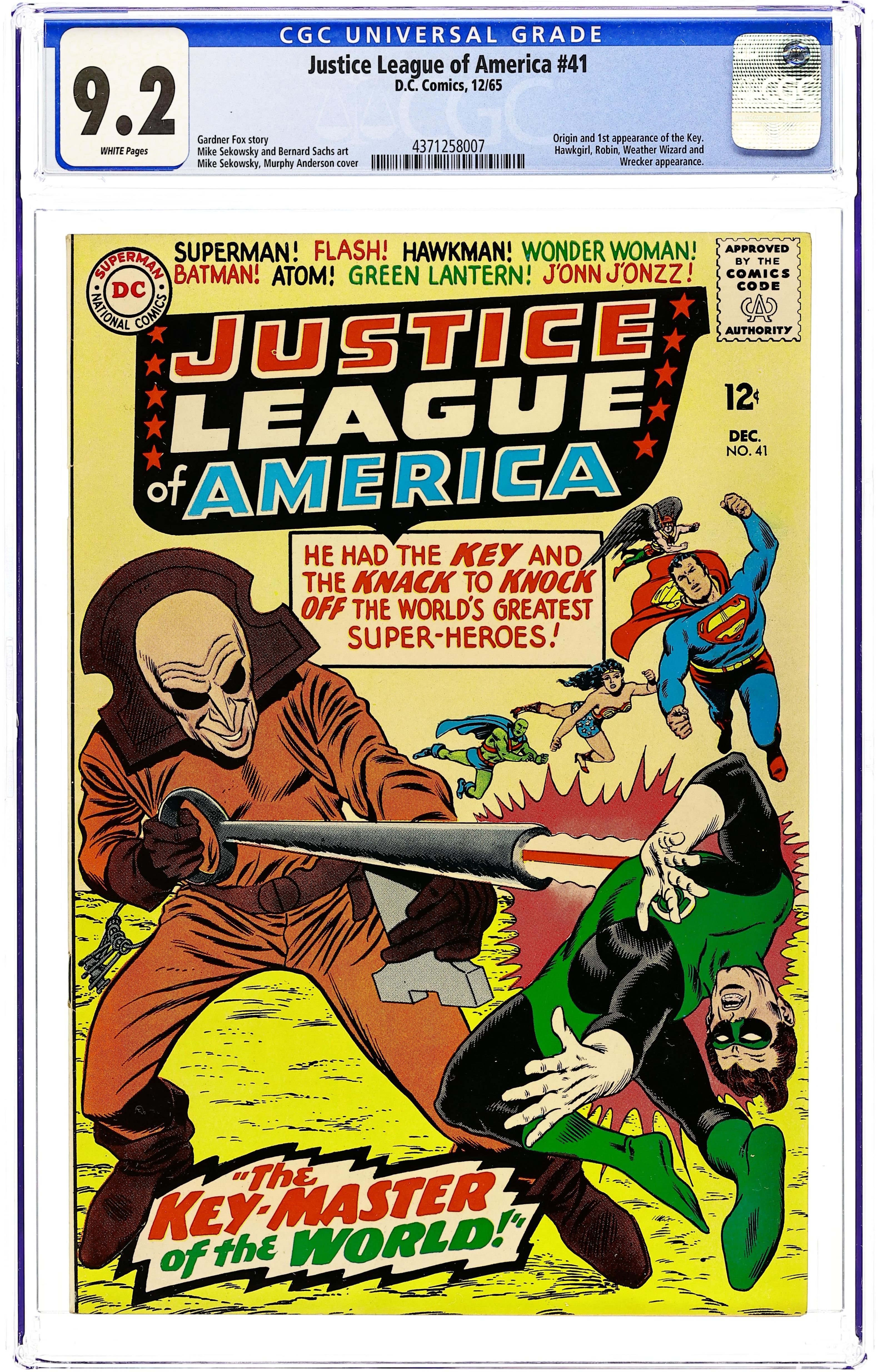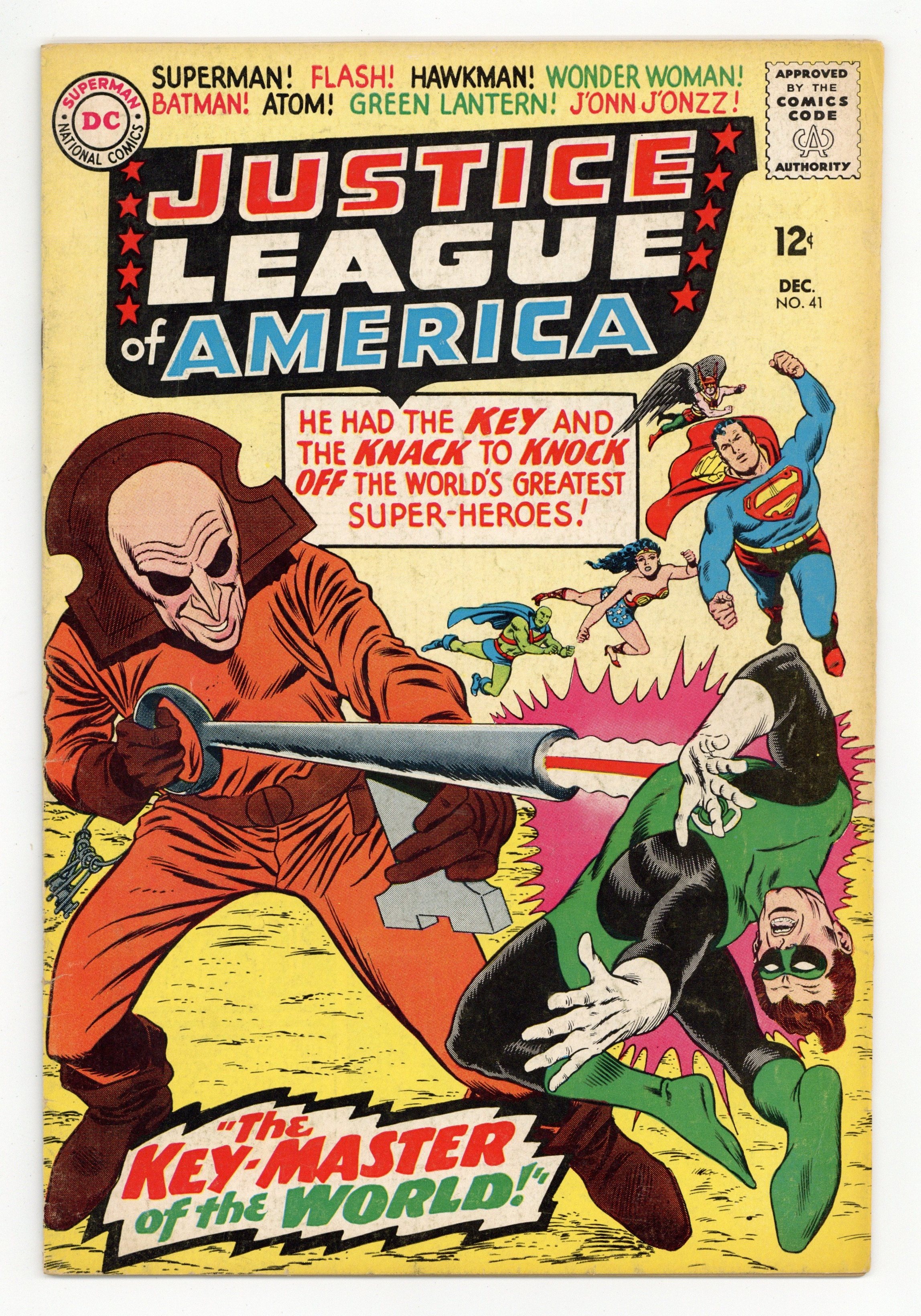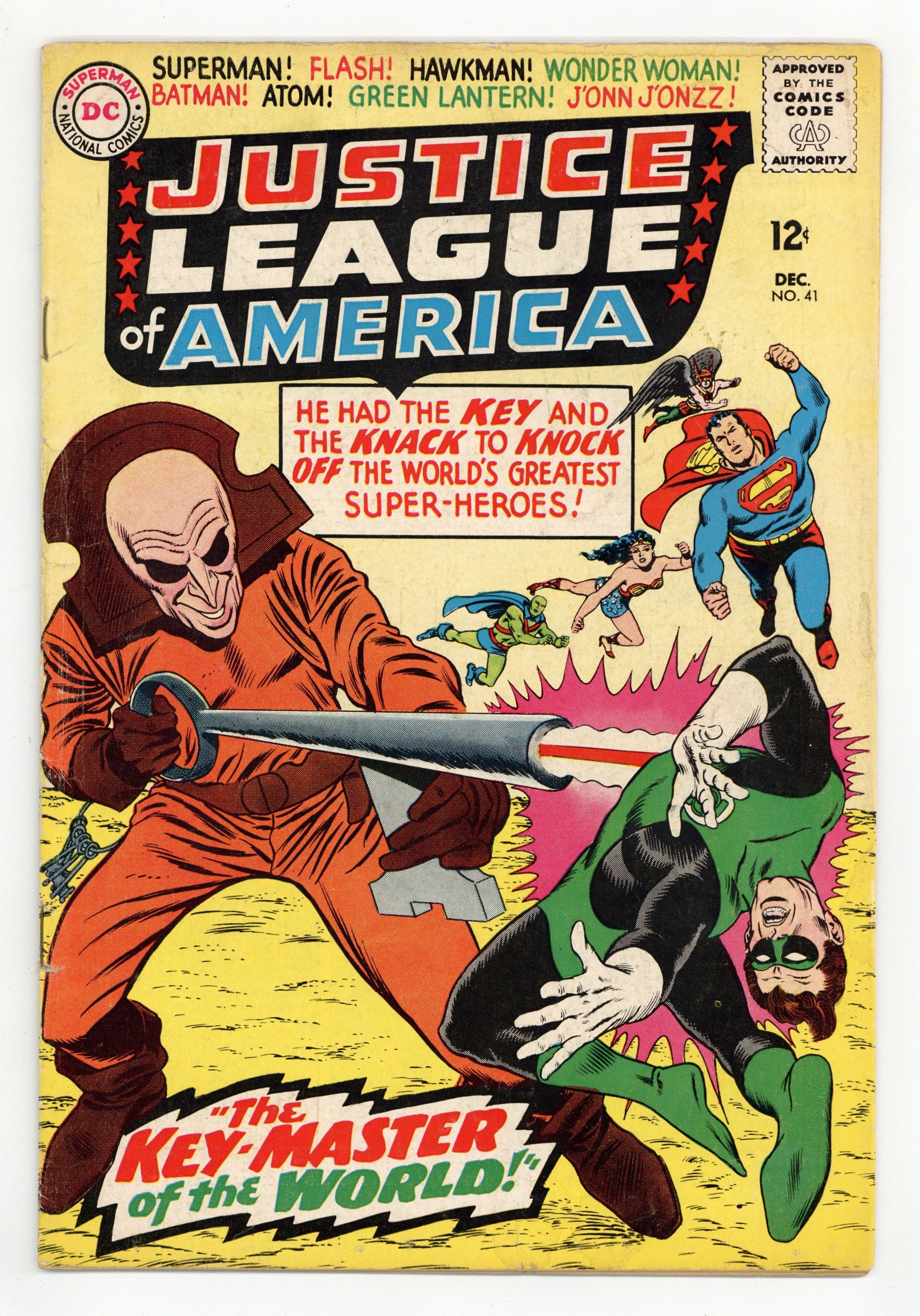Cover pencils by Mike Sekowsky, inks by Murphy Anderson. Builders of the Future! public service announcement, art by Sheldon Moldoff. The Key-Master of the World!, script by Gardner Fox, pencils by Mike Sekowsky, inks by Bernard Sachs; The Key administers a psycho-chemical to the JLA which forces them to disband and become unable to see his henchmen commit robberies; However, they are returned to normal when Hawkgirl discovers the situation, and go on to defeat The Key. Notes field: Hawkman uses the Absorbascon to discover the secret identities of the JLA members. Cap's Hobby Center by Henry Boltinoff. Cover price $0.12.
