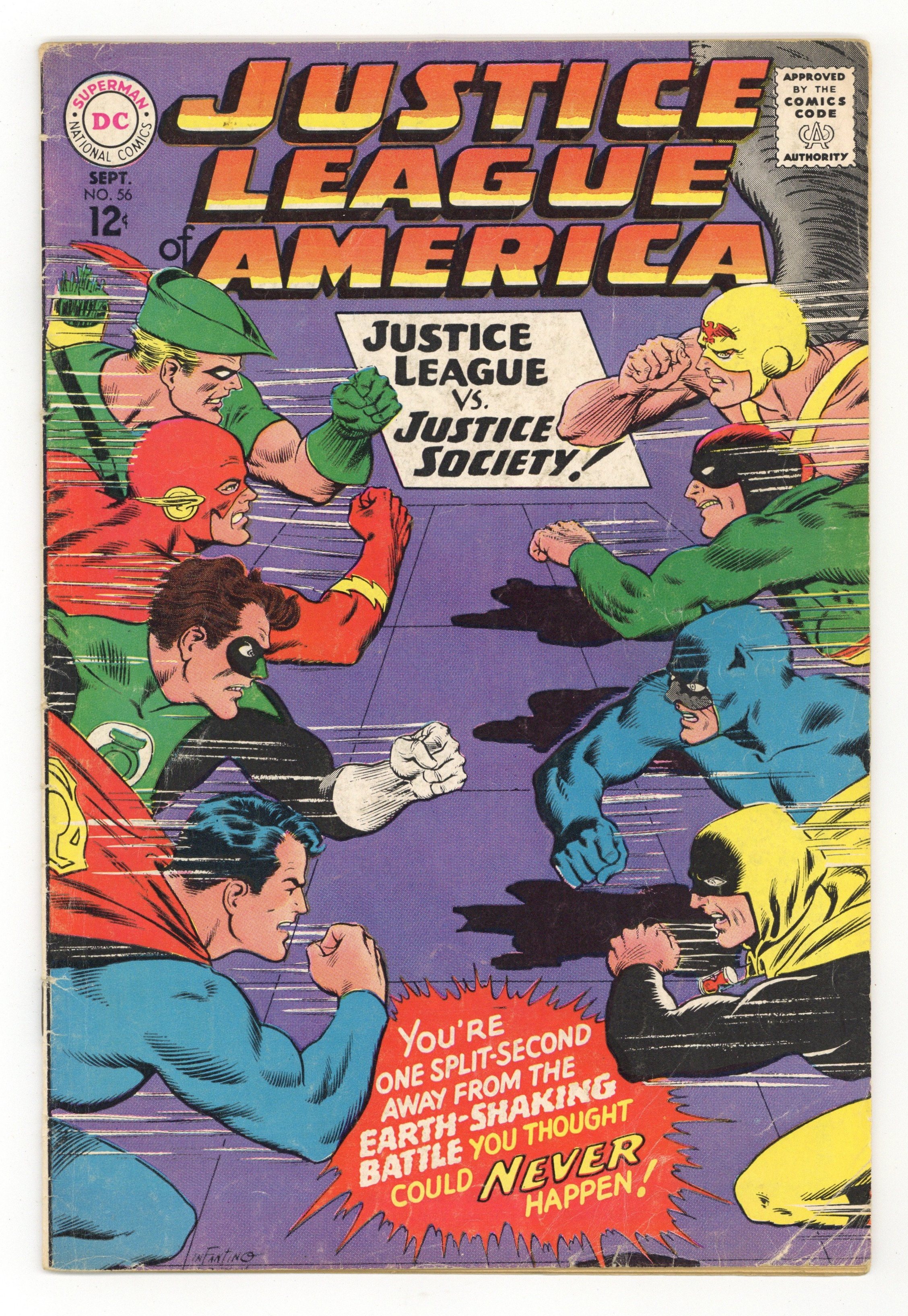 Cover pencils by Carmine Infantino, inks by Murphy Anderson. The Negative Crisis on Earths One-Two!, script by Gardner Fox, pencils by Mike Sekowsky, inks by Sid Greene; The JLA and JSA team up to stop the Black-Sphered Villains on Earth-2, using artificial means to power up four of their own with black matter, but it almost backfires when the four heroes become evil; The remaining heroes are then subconsciously helped by the four heroes into defeating them by exposing their weaknesses; These same weaknesses are then used vs. the four earlier-charged normal persons, who then lose their powers as well; Things are returned to normal on Earth-2, and the four Leaguers return to their world to stop the charged persons there using the same weaknesses; 1st Golden Age Wonder Woman in the Silver Age. 36 pgs. $0.12. Cover price $0.12.
