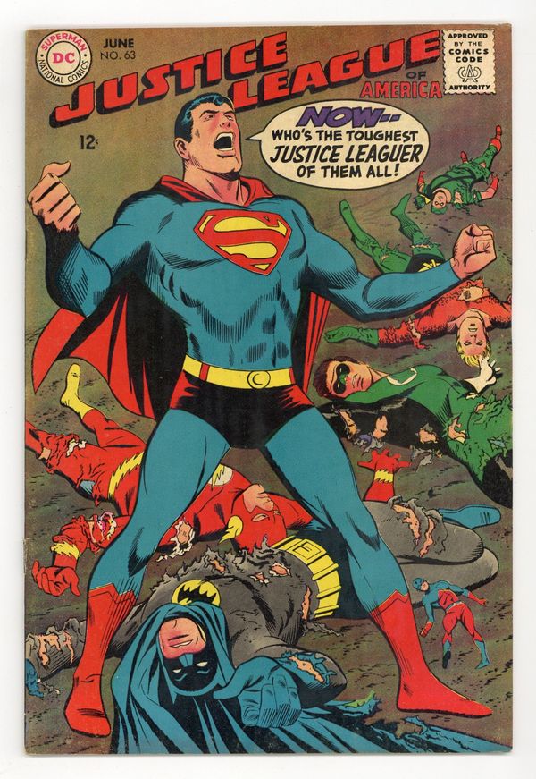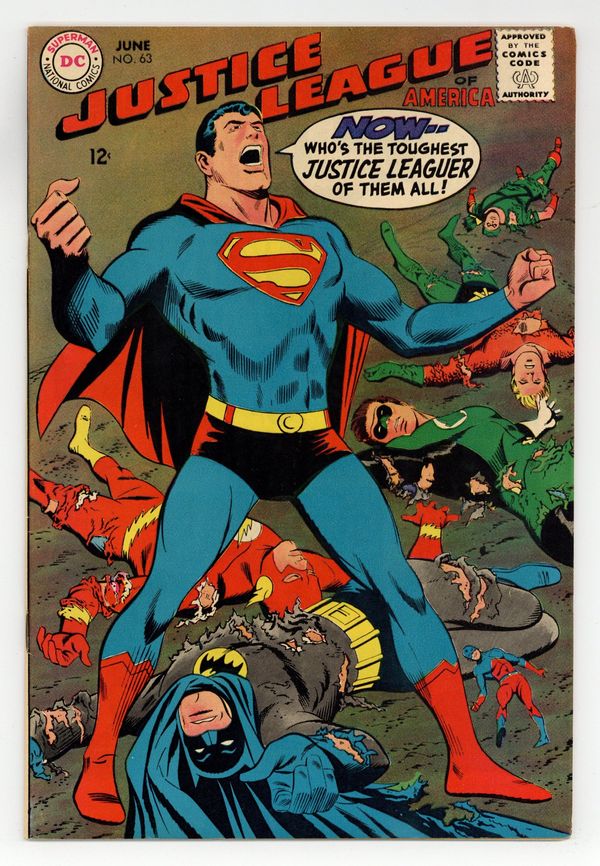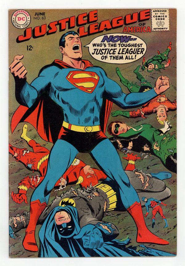 Cover pencils by Mike Sekowsky, inks by Jack Abel. Time Signs a Death-Warrant for the Justice League!, script by Gardner Fox, pencils by Mike Sekowsky and Jim Shooter (layout), inks by George Roussos; the Key mind controls the JLA to not leave their headquarters and to kill one another after an hour; Superman travels three years into the past. 32 pgs. $0.12. Cover price $0.12.