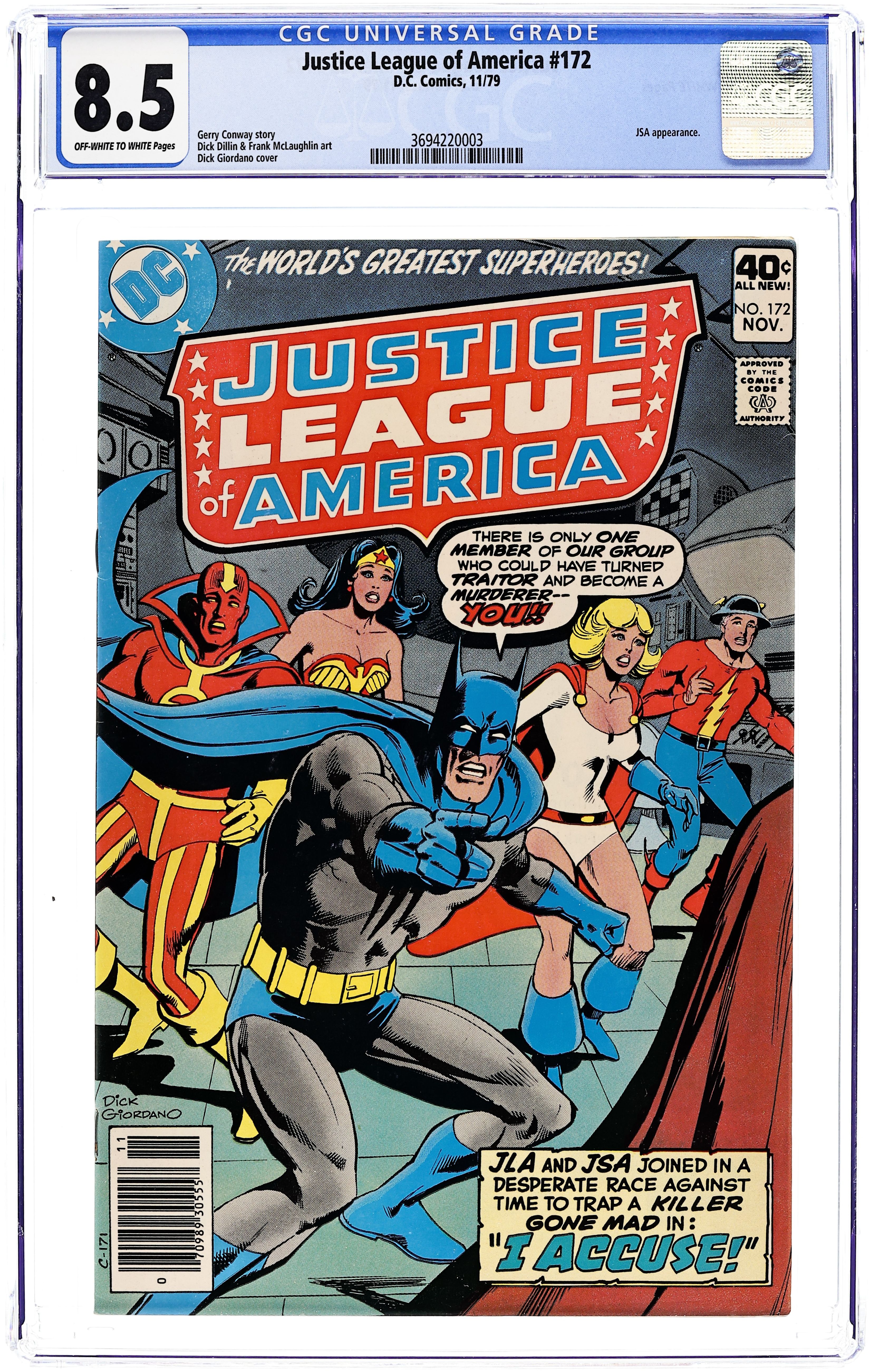 The annual Justice League of America and the Justice Society of America team-up (continued from issue #171). Cover art by Dick Giordano for "I Accuse...!" in which the JLA and the JSA battle with the Spirit King, and face the possibility that one of their number is a murderer. Plotted by Ross Andru and written by Gerry Conway with art by Dick Dillin and inks by Frank McLaughlin. JLA featured heroes this issue: Superman, Batman, Flash, Green Lantern, Hawkman, Zatanna, and the Red Tornado. Guest stars: Power Girl, Huntress, Earth-2 Green Lantern, Earh-2 Flash, Earth-2 Hawkman, Dr. Fate and Mr. Terrific. Cover price $0.40.