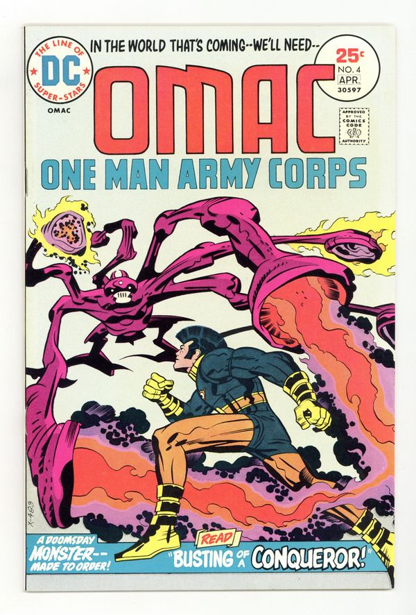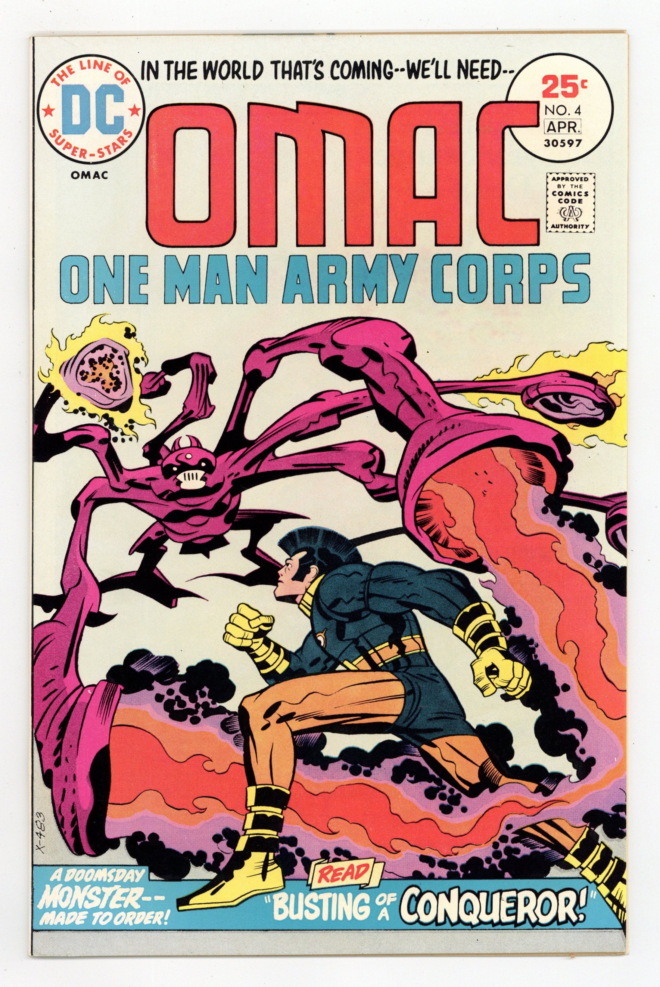 $19.25"The Busting of a Conqueror." Ruthless dictator Kafka goes to trial (thanks to Omac), but is confident that his avenger will free him. Script and pencils by Jack Kirby, inks by D. Bruce Berry. Cover by Kirby and Berry. Cover price $0.20.