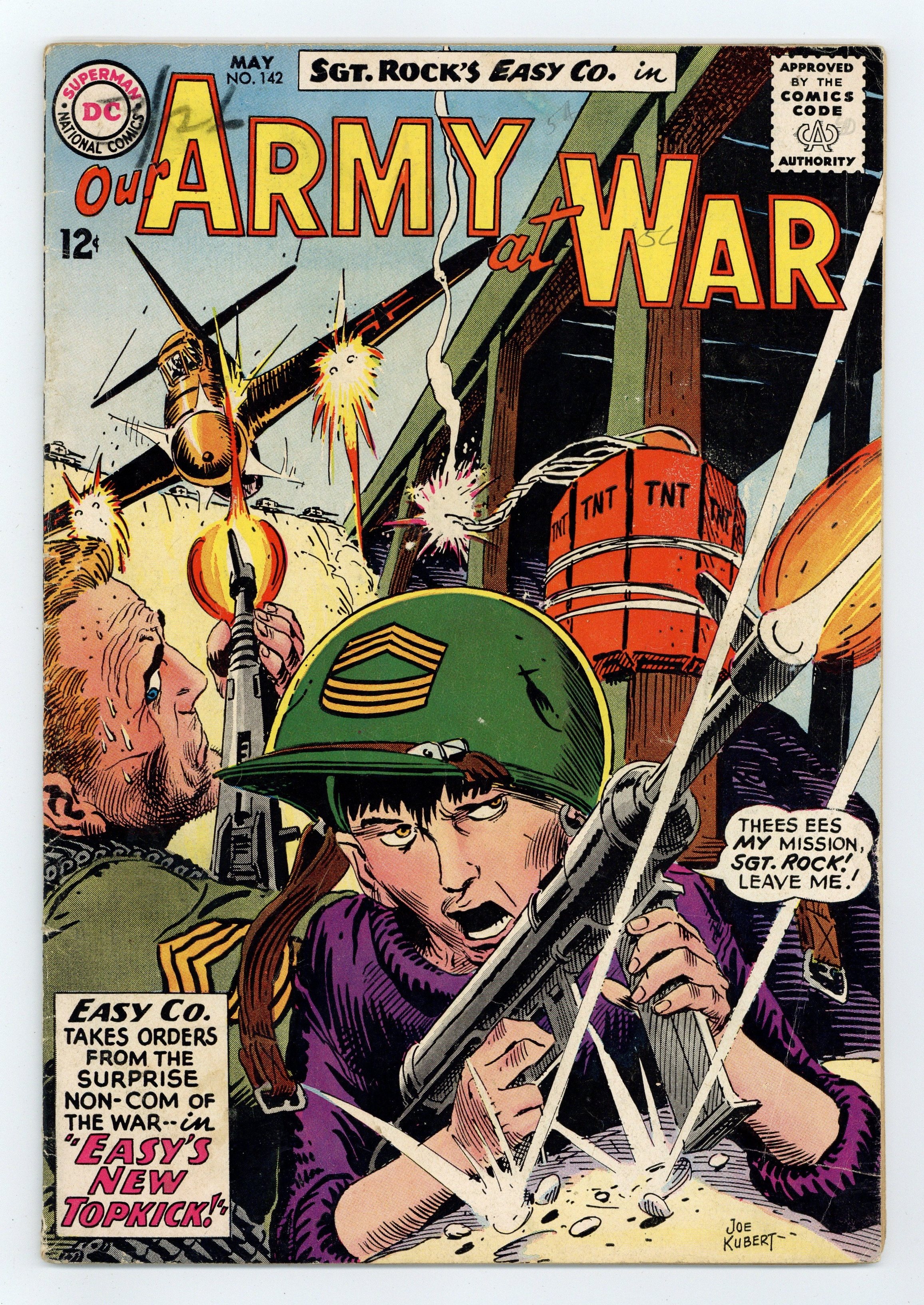 Cover art by Joe Kubert. Easy's New Topkick starring Sgt Rock, script by Bob Kanigher, art by Joe Kubert. Nose-Dive Champ, script by Kin Platt, art by Jack Abel. War Mottoes fact page. 36 Pages, Full Color. Cover price $0.12.