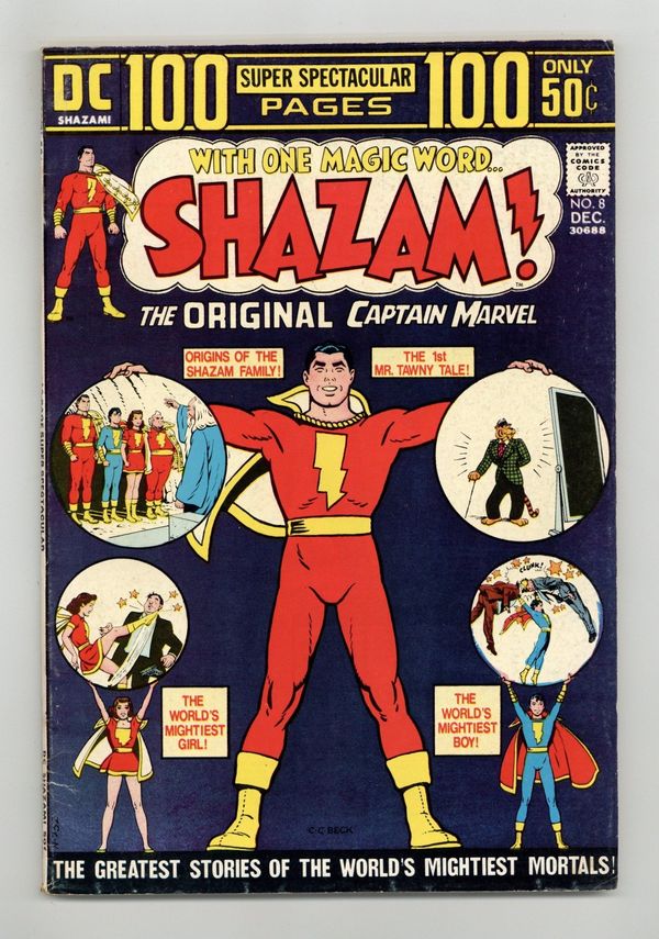 Tags: DC 100 Page Giant$37.00100-page giant; all reprints. "A Twice-Told Tale" (from Captain Marvel Adventures 80 in 1947), "The Original Captain Marvel Introduces Mary Marvel" (from CMA 18 in 1942; script by Otto Binder), "The Mighty Marvels Join Forces" (from Marvel Family 1 in 1945), "Captain Marvel Jr. and the Vest Pocket Levitator" (from Captain Marvel Junior 14 in 1943; art by Mac Raboy), "Mary Marvel and the Dog-Nappers" (from Mary Marvel 17 in 1947; art by Jack Binder), "The Original Captain Marvel and his Three Lieutenant Marvels in the Adventure in Time" (from CMA 71 in 1947), "The Talking Tiger" (from CMA 79 in 1947; script by Binder, art by C.C. Beck), and "The Return of Mr. Tawny" (from CMA 82 in 1948). New Beck cover. Cover price $0.50.