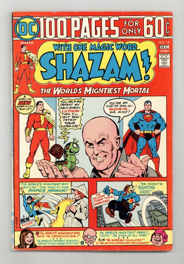 Tags: Giant-Sized Issue, Superman$14.25100-page giant. Two new stories: "Captain Marvel Meets Lex Luthor!?!" Script by Denny O'Neil. pencils by Bob Oksner, inks by Tex Blaisdell. Guest starring Mr. Mind. Captain Marvel Jr. stars in "The Man in the Paper Armor!" Script by E. Nelson Bridwell, art by Kurt Schaffenberger. Reprints: "Mary Marvel Meets the Chameleon Girl" (from Marvel Family 47 in 1950), "Sivana's Good Inventions" (from MF 50 in 1950; art by Pete Costanza), "The Marvel Family Battles the King of All Time" (from MF 88 in 1953; art by Kurt Schaffenberger), "The Incredible Calculator" (from Captain Marvel Adventures 53 in 1946; pencils by C.C. Beck, inks by Costanza), "Mr. Tawny's Bouncing Shoes" (from CMA 134 in 1952; art by Beck), "The Day Civilization Went Backwards" (from CMA 115 in 1950; art by Costanza). Oksner cover. Cover price $0.60.