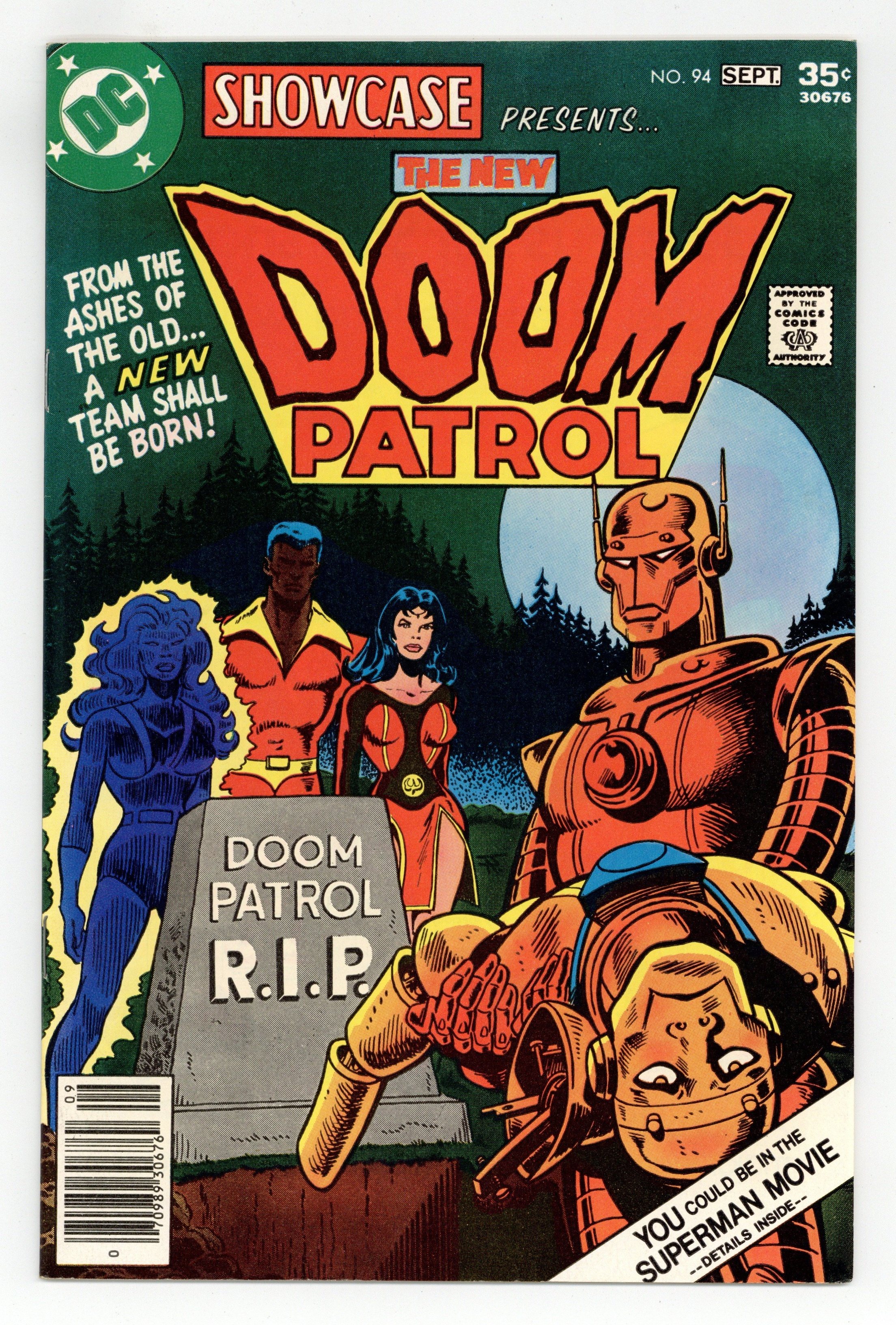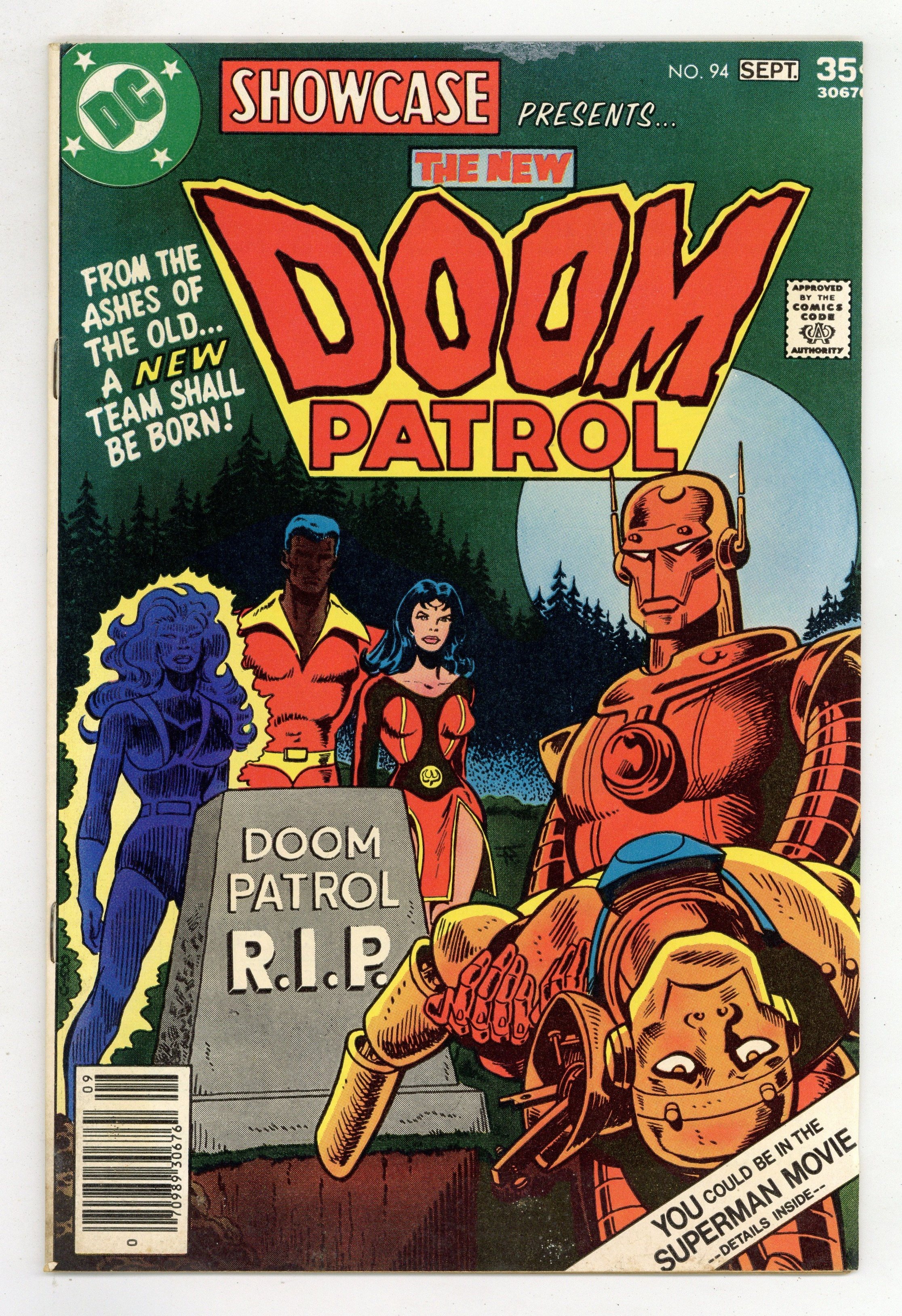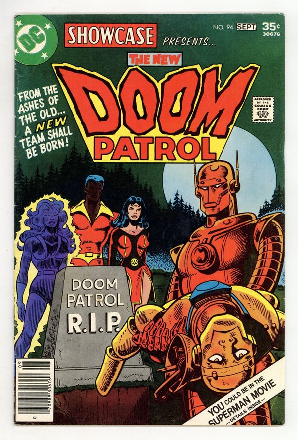 First 35-cent cover price. Cover by Jim Aparo. 1st appearance of the new Doom Patrol in "The Doom Patrol Lives Forever!", script by Paul Kupperberg, art by Joe Staton; After Robotman survives the blast that killed his teammates, he is reconstructed and returns to the Doom Patrol's headquarters; He expects the mansion to be empty, but instead finds a new team has taken up residence there; Before he can find out more about this new Doom Patrol, the team is attacked by General Immortus. A short history of the Showcase series, what's coming for this feature, and the address for sending letters of comment and recommendations of future Showcase stars by Paul Levitz. 36 Pages, Full Color. Cover price $0.35.