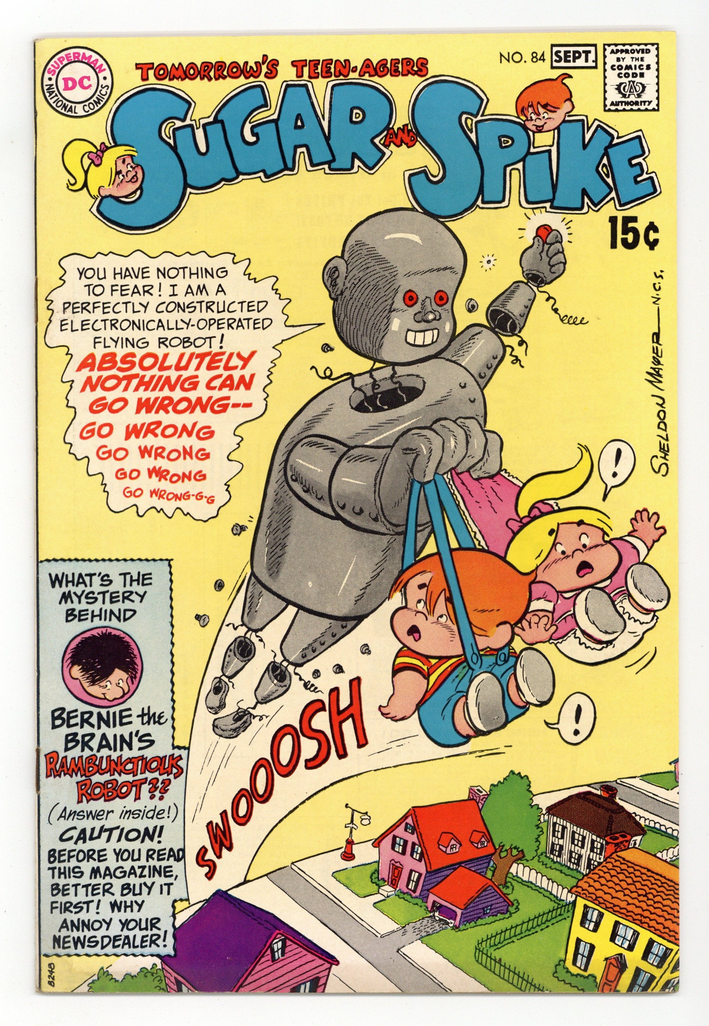 Cover art by Sheldon Mayer. Stories starring Sugar & Spike: Bernie the Brain's Biggest Blunder, Mathen By Machine (chap 2), and Rambunctious Robot (chap 3). Scripts and art by Sheldon Mayer. Pint-Size Pin-Ups paper dolls by Mayer. 36 Pages, Full Color. Cover price $0.15.