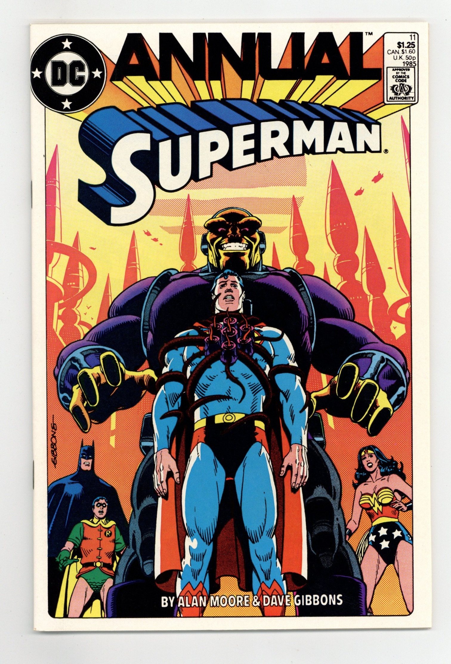 Direct Edition. "For the Man Who Has Everything!" Guest-starring Wonder Woman, and Batman and Robin. Written by Alan Moore. Art by Dave Gibbons. The amazing creative team that brought you Watchmen deliver one of the all-time great Superman tales. When Batman and Wonder Woman arrive at the Fortress of Solitude for Superman's birthday, they soon discover the evil Mongul has beat them there and enslaved the Man of Steel within a prison of his own mind. How can they possibly hope to defeat this monstrous alien menace without the help of Superman? 48 pages, FC. Cover price $1.25.