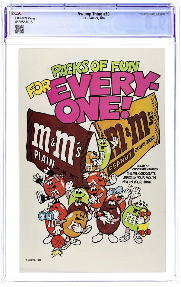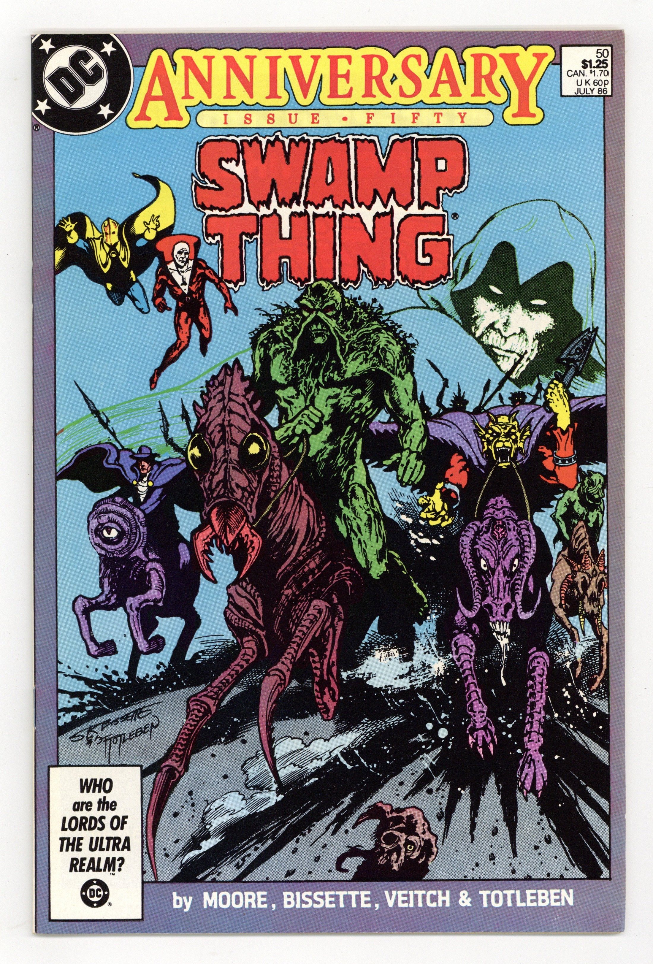 52-page giant Anniversary issue. Cover by Stephen R. Bissette and John Totleben. The End, script by Alan Moore, art by Stephen Bissette, Rick Veitch, John Totleben, and Tom Mandrake; While John Constantine and the mystical heroes of the DC Universe wage a last-ditch effort to hold back the evil of the Brujeria, Swamp Thing, the Demon and others descend into hell itself to battle a horde of demons; includes Phantom Stranger, Spectre, Doctor Fate, and Deadman. 52 pgs., full color. $1.25. Cover price $1.25.