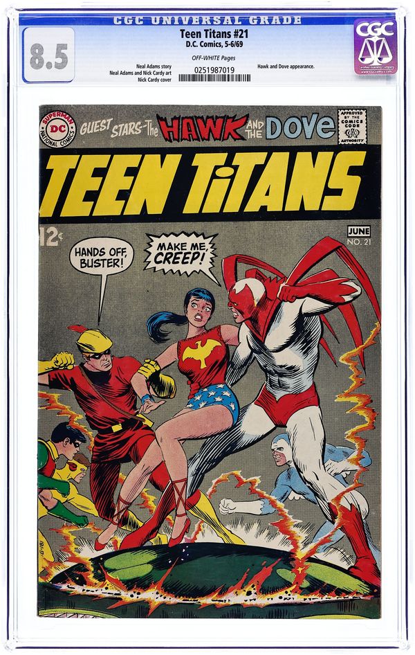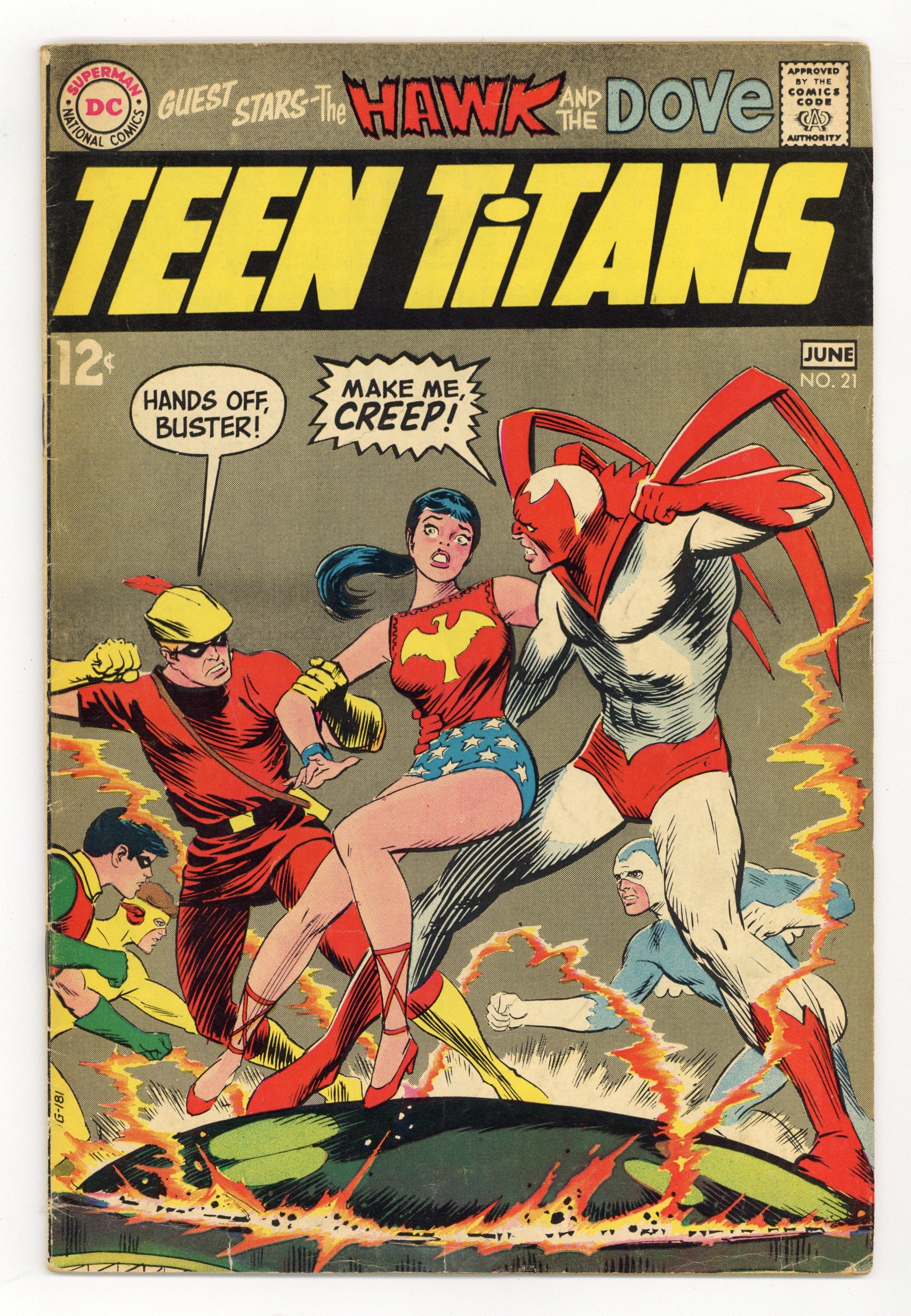 Written by Neal Adams. Art by Neal Adams and Nick Cardy. Cover by Nick Cardy. The Titans continue the search for the aliens of Dimension X with the help of Hawk and Dove. Robin and Kid Flash are captured by the aliens. 36 Pages, Full Color. Cover price $0.12.