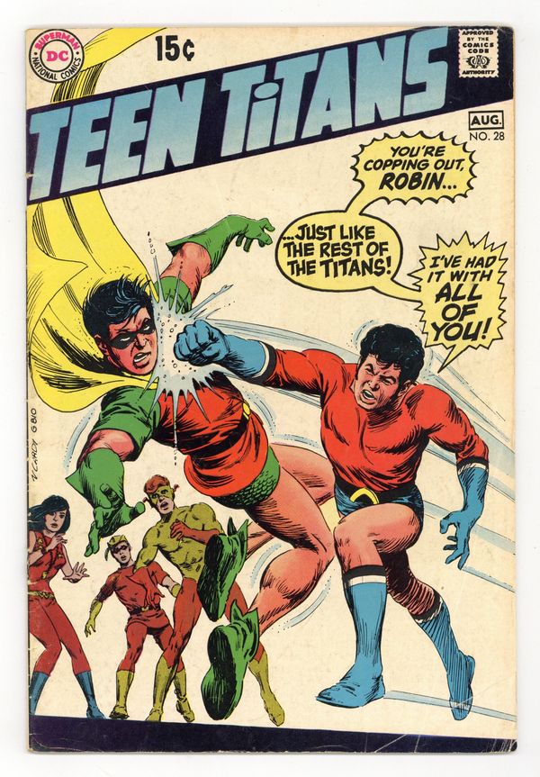 Written by Steve Skeates. Art and cover by Nick Cardy. Aqualad and Robin ask the Titans for help when Donna's room-mate Sharon Tracy is attacked. When the Titans won't help, Aqualad goes on his own to stop Ocean Master. 36 Pages, Full Color. Cover price $0.15.